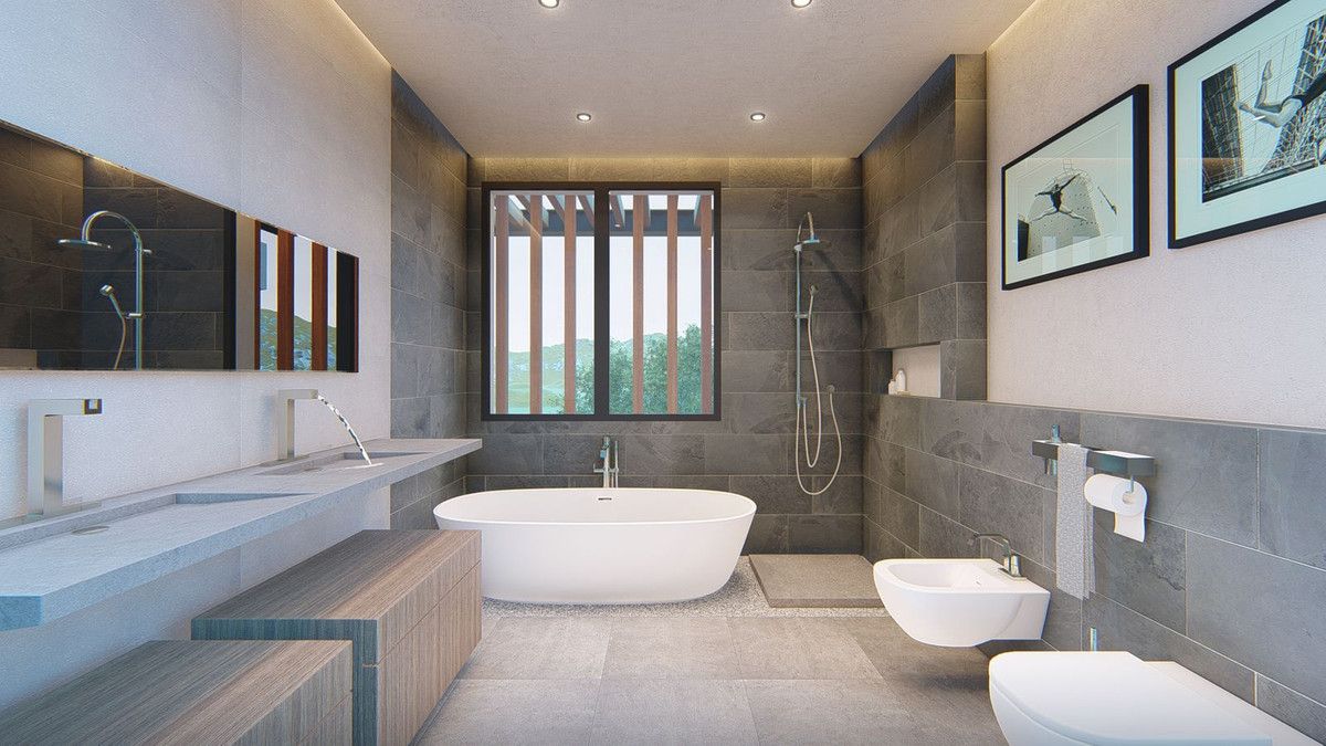 Upper level has three bedrooms which share terrace are to the right and a master bedroom with private bathroom, dressing room and shower is to the left-hand side. The views encompass golf, lake and the sea views.