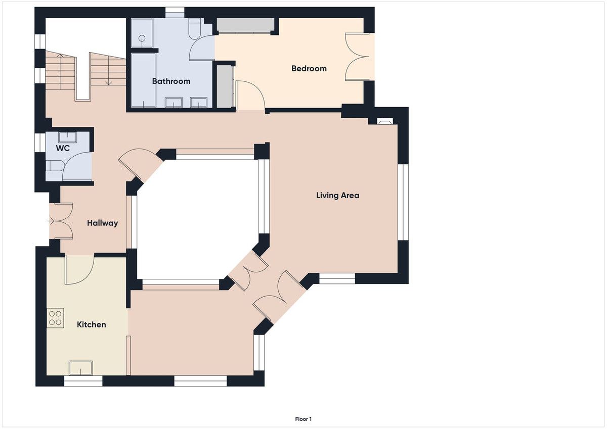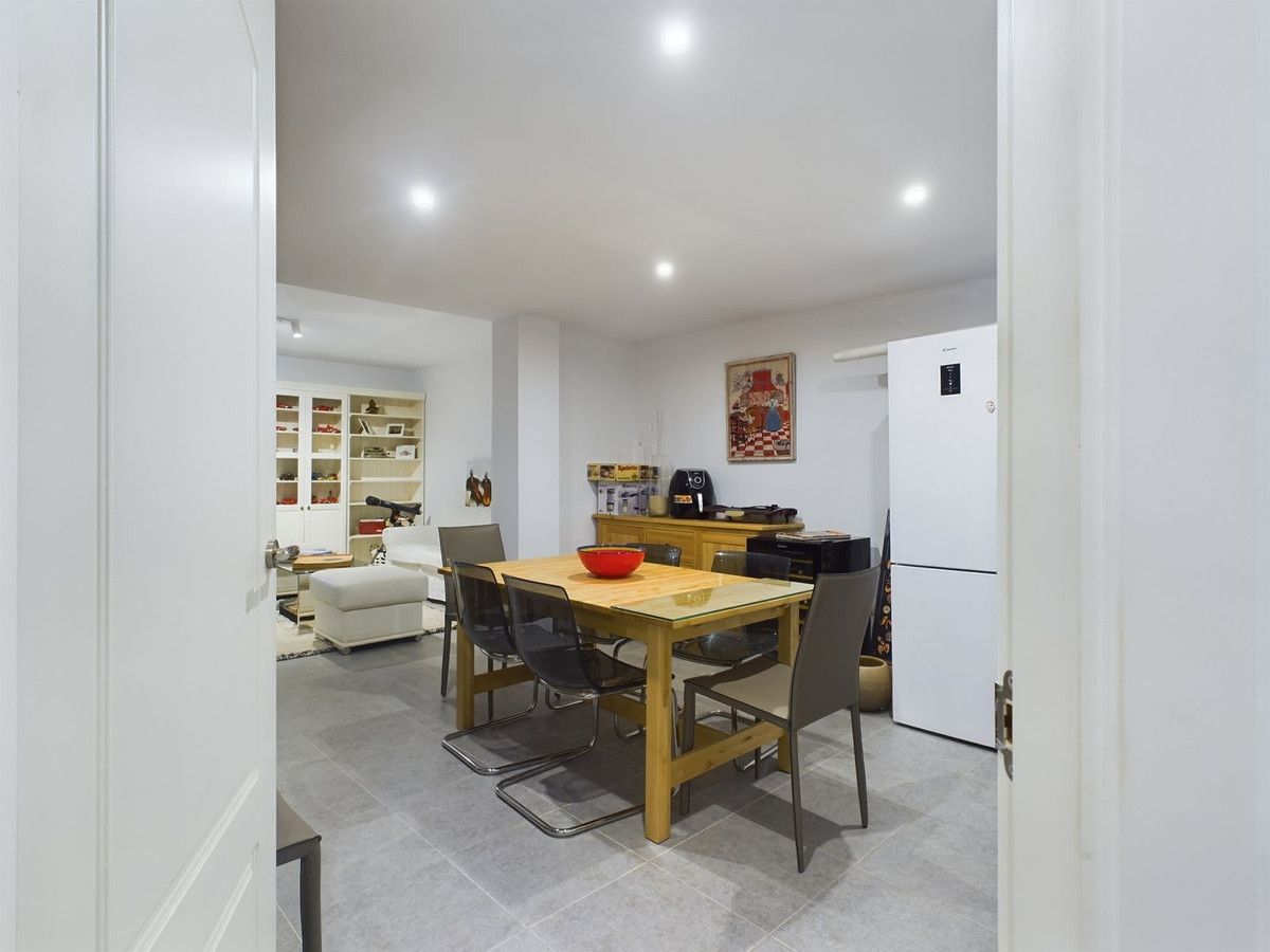 Inside, the layout flows effortlessly. You're welcomed by a stylish entrance hall that leads into a modern open-plan kitchen and dining area. From there, you step into a spacious living room with high ceilings and a cosy fireplace—ideal for relaxing or entertaining. This level also features a guest WC and a generous en-suite bedroom with French doors that open directly onto the garden.