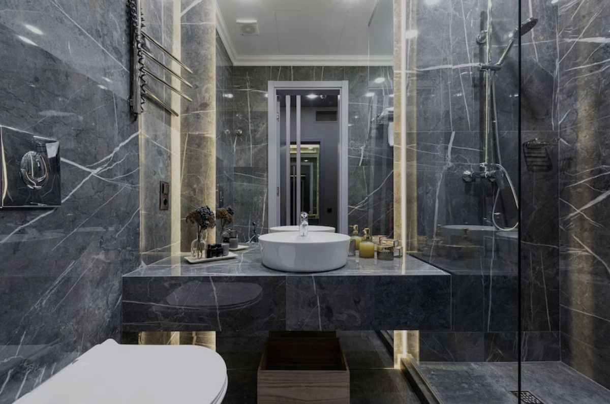 – Bathroom walls covered with COVERLAM wall plates
