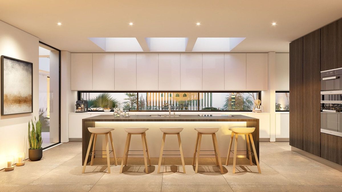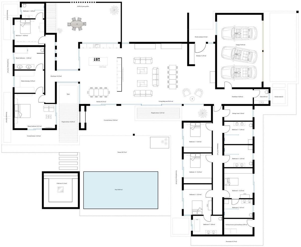 ECOLOGICAL PASSIVE VILLA IN SOTOGRANDE WITH VIEWS OF THE SEA This property will be constructed on 1 floor with the highest specifications possible and consisting of; Entrance hall with wardrobe, huge living/dining room separated with kitchen wardrobes but still partly open. Through a distributor you go to the master bedroom with ensuite bathroom and dressing. In this part of the villa there is also another bedroom with ensuite bathroom. The fully fitted kitchen with all appliances give out to a walled courtyard with a pergola terrace. On the other side of the villa, we have a distributor with guest toilet, a huge garage, storage room, another distributor with 2 bedrooms with 2 bathrooms and 2 further bedrooms with ensuite bathroom. Furthermore, there are several covered terraces, pergola terraces and terrace with a chill-out, heated swimming pool and an open garden storage. Pictures of the bathrooms and kitchen are only examples final choice of the finishings shall be for the client within the chosen line that we propose. Example of some of the specifications, – Interior and exterior floor tiles from GRESPANIA or LIVING CERAMICS 600×600 – 800×800 – 1200×1200 (Colour and size to choose) – Bathroom walls with COVERLAM or LIVING CERAMICS plates 2700X1200 (Color to choose) – Bathrooms from ROCA – DURAVIT – VILLEROY BOCH – GEBERIT – HANSGROHE OR SIMILAR – Aerothermia/airconditioning – Electric underfloor heating in the bathrooms – Hydraulic underfloor heating in living room, and bedrooms – Ceiling high windows from Reynaers or similar with a sunken track, Planistar glass of 5+5/chamber/6+6 – Ceiling high pivot entrance door 1,50 wide – Ceiling high and 1-meter wide interior doors – Fully fitted kitchen with aluminum frame doors and covered with COVERLAM (Colour to choose) – Island with COVERLAM 3600X1600 no visible joints (Color to choose) – White goods from Bosch or AEG – Heated pool – 24 solar panels – 2 lithium batteries of each 10kW – Car charger