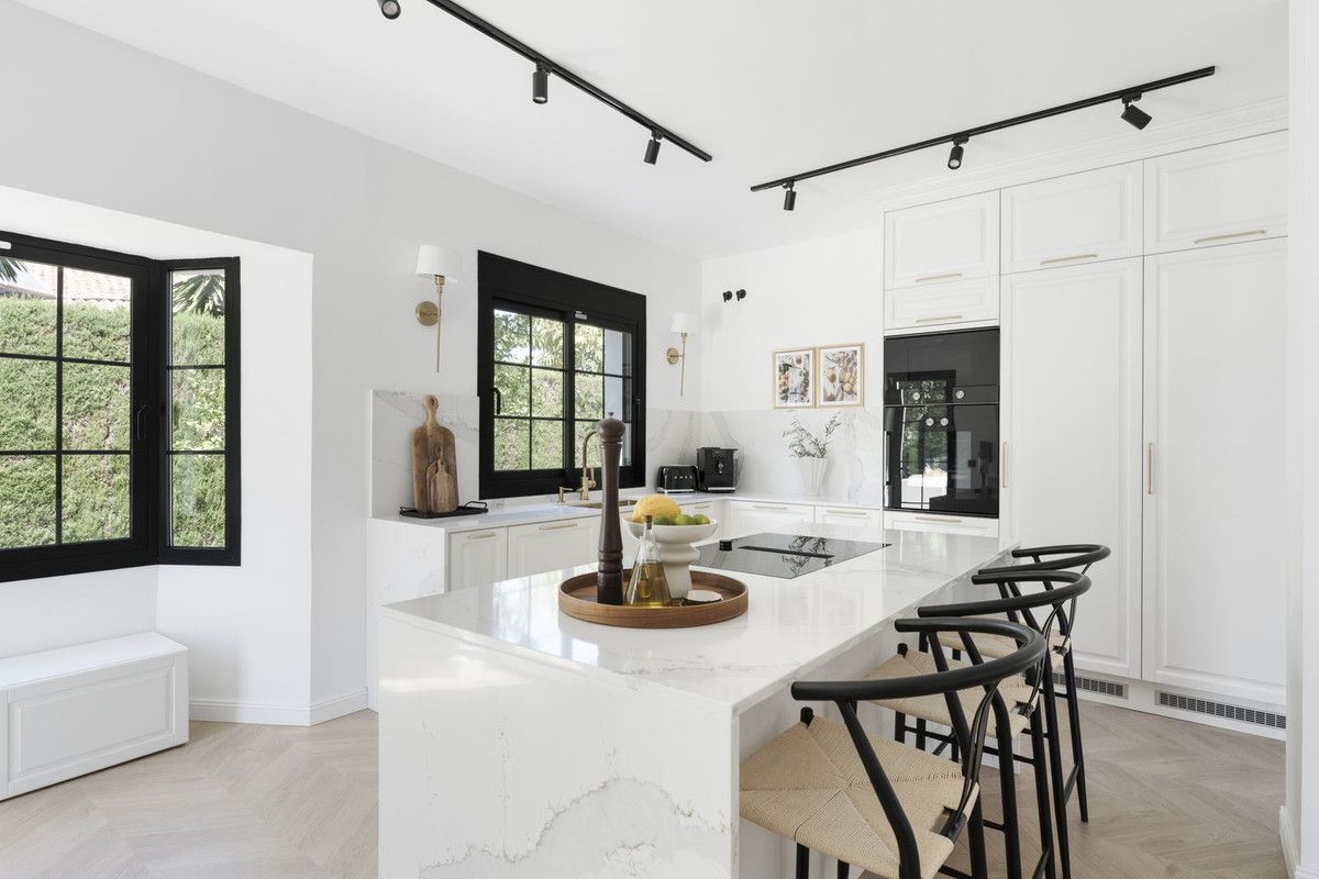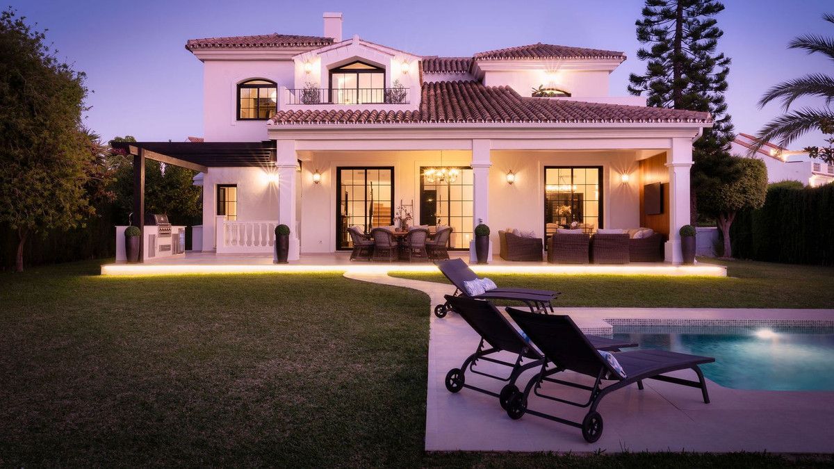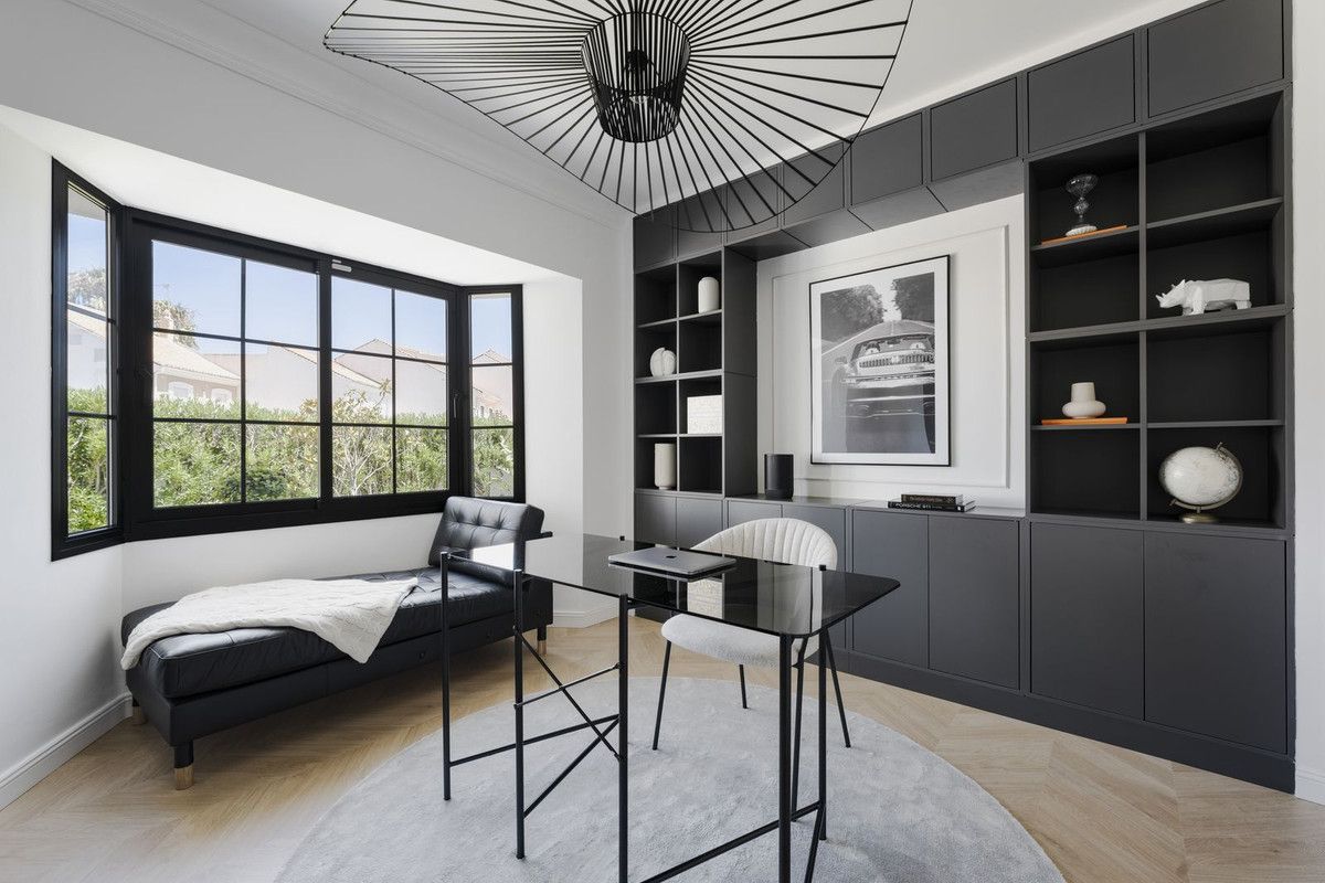 Welcome to this elegant villa that has recently gone through a total renovation located in Monte Biarritz. As you enter you are greeted by an abundance of light and space where the chosen materials blend perfectly. The generously sized ground floor of the villa has an open plan distribution with both formal and informal dining area, an office and a bedroom suite. The large terrace doors take you to the covered terrace, to the bbq area and out to the garden and heated pool. On the second floor you have the beautiful master suite, a relax area and 2 bedrooms sharing a bathroom. The basement area has been fitted with a home cinema, big laundry area, a family bathroom and the 5th bedroom, there is also direct access to the garage from here. Situated in a well established residential area with ammenities nearby and the beach is only a short distance away. A true gem of a property!!