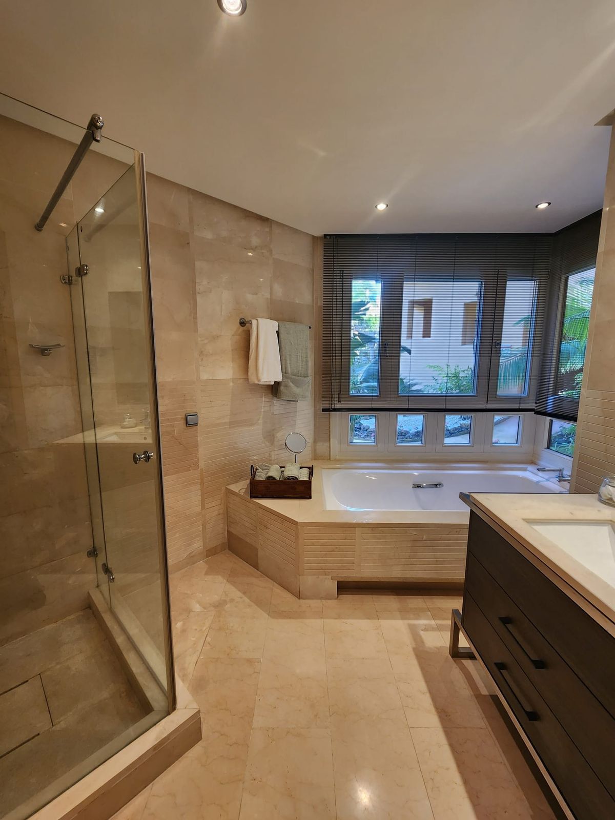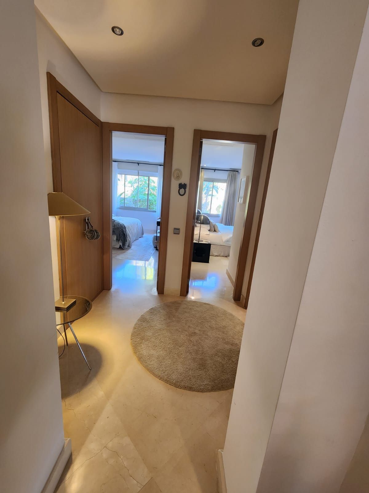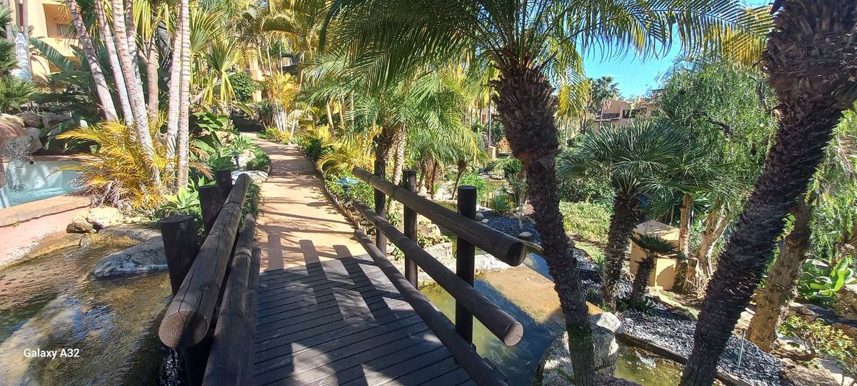 Enter into the apartment to a real sensation of luxury and space, you have on the left a new refurbished American style kitchen with with breakfast bar, large sitting/dining room which leads out to a bright sunny terrace with glass curtains so this creates another large sitting and dining room area which is so cosy in the winter and cool in the summer. This leads out to another part of the terrace al fresco and garden where you can sunbath w sound of thith the background noise of the little stream/water feature in the garden area so makes it even more relaxing.