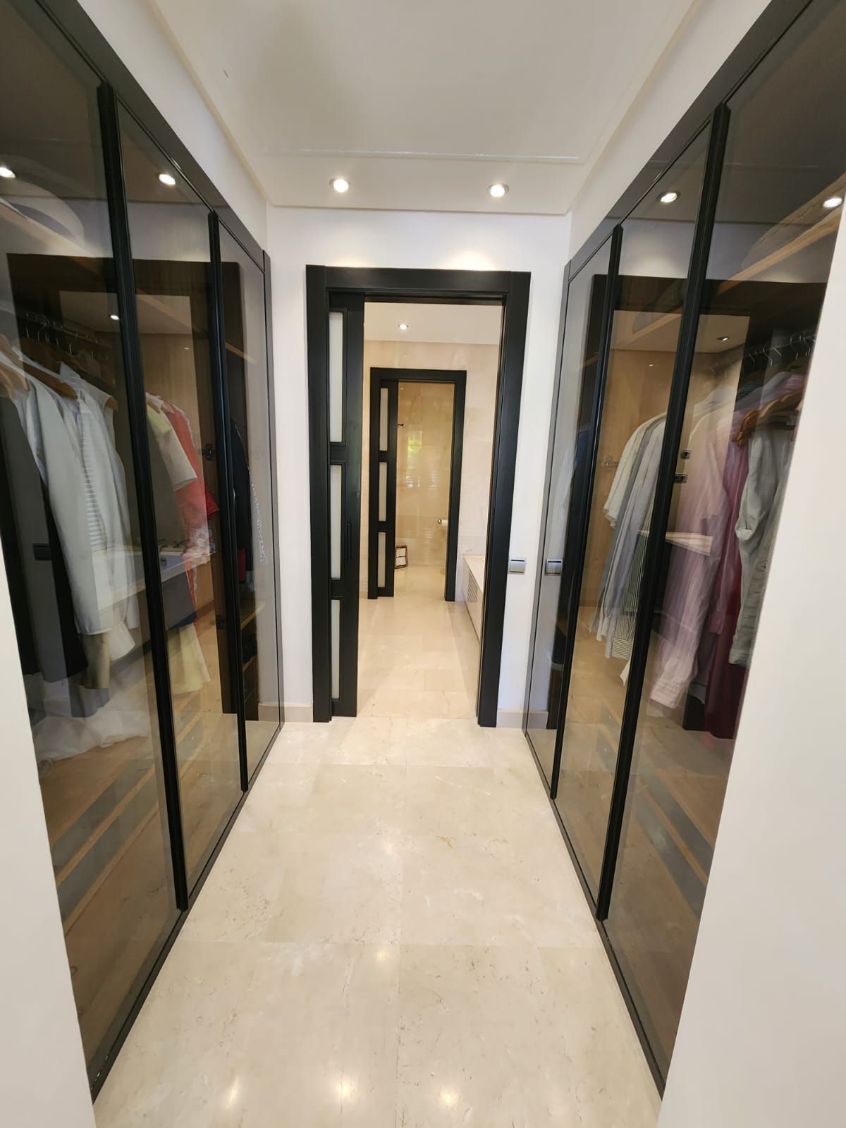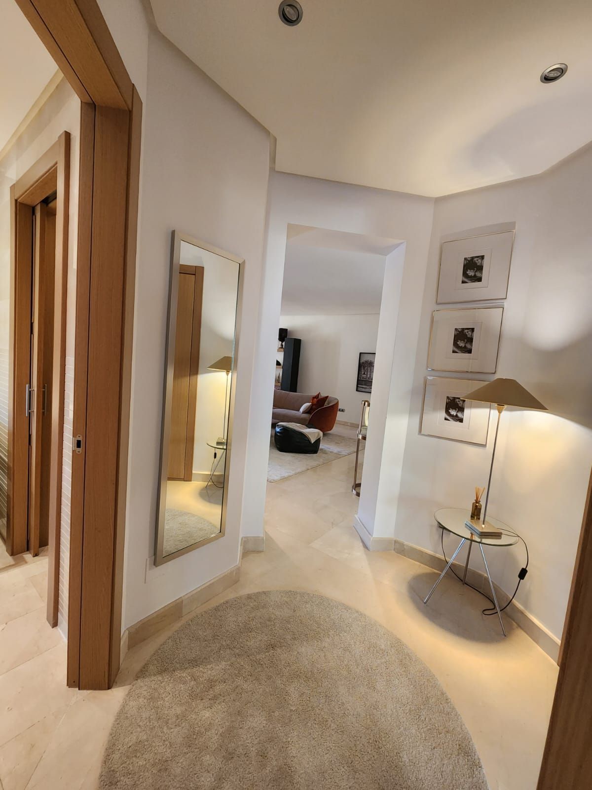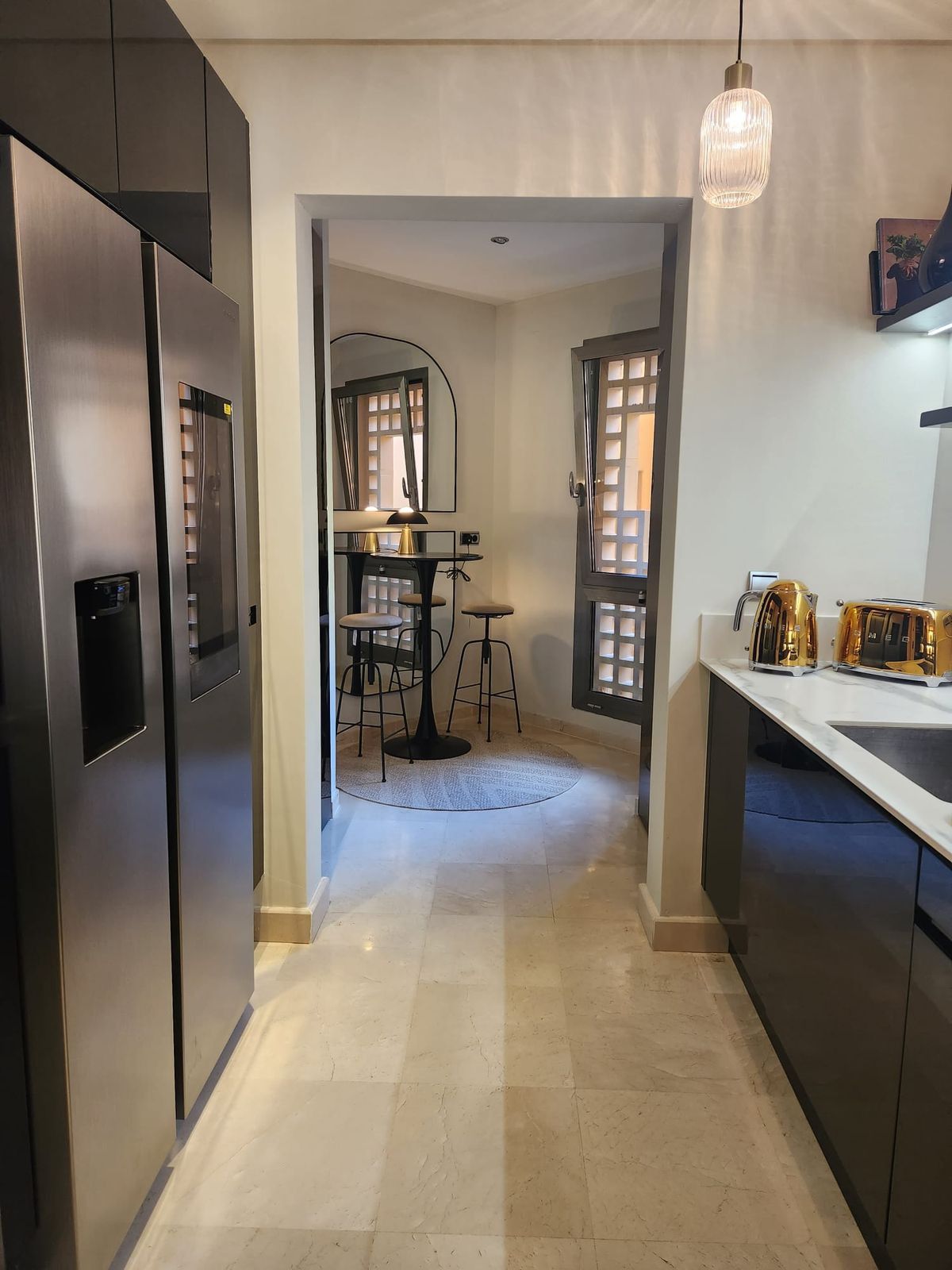 Enter into the apartment to a real sensation of luxury and space, you have on the left a new refurbished American style kitchen with with breakfast bar, large sitting/dining room which leads out to a bright sunny terrace with glass curtains so this creates another large sitting and dining room area which is so cosy in the winter and cool in the summer. This leads out to another part of the terrace al fresco and garden where you can sunbath w sound of thith the background noise of the little stream/water feature in the garden area so makes it even more relaxing.