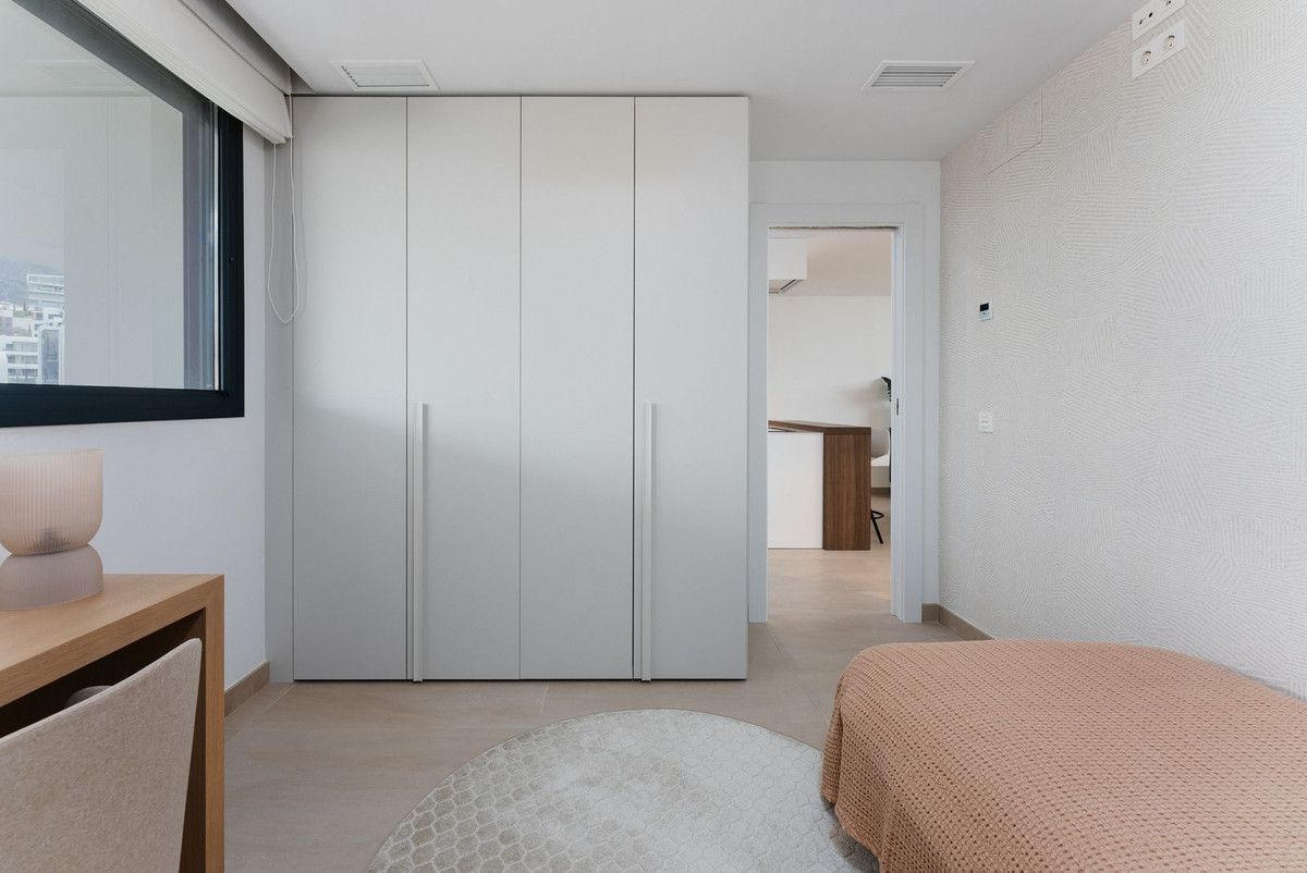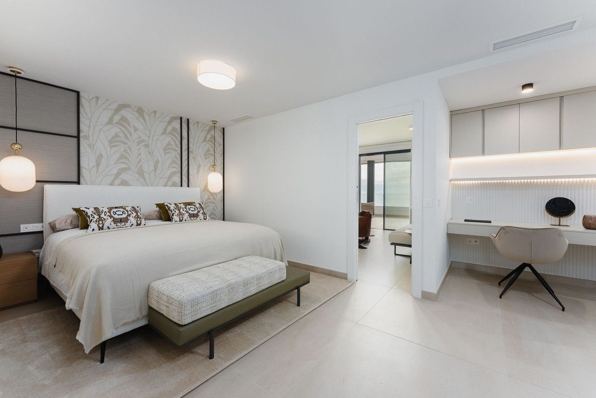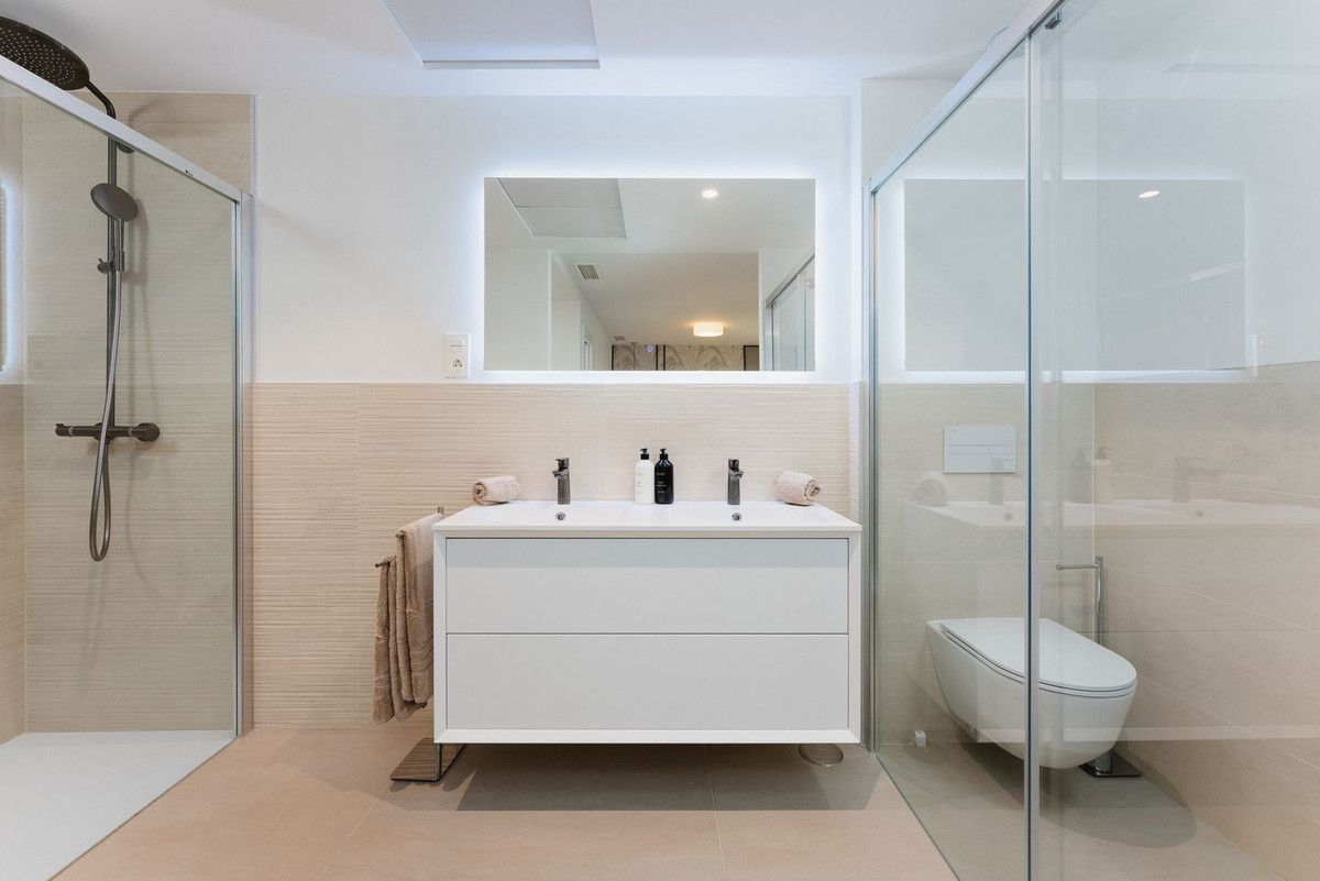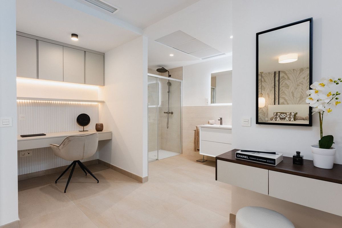 Layout: master bedroom with en-suite bathroom and dressing room and working nook, second bedroom also fully furnished with separate bathroom and toilet and great sea view. The third bedroom has, apart from the bed, a very practical working area with a desk. Of course there are built-in wardrobes. The room has a separate fully furnished bathroom.