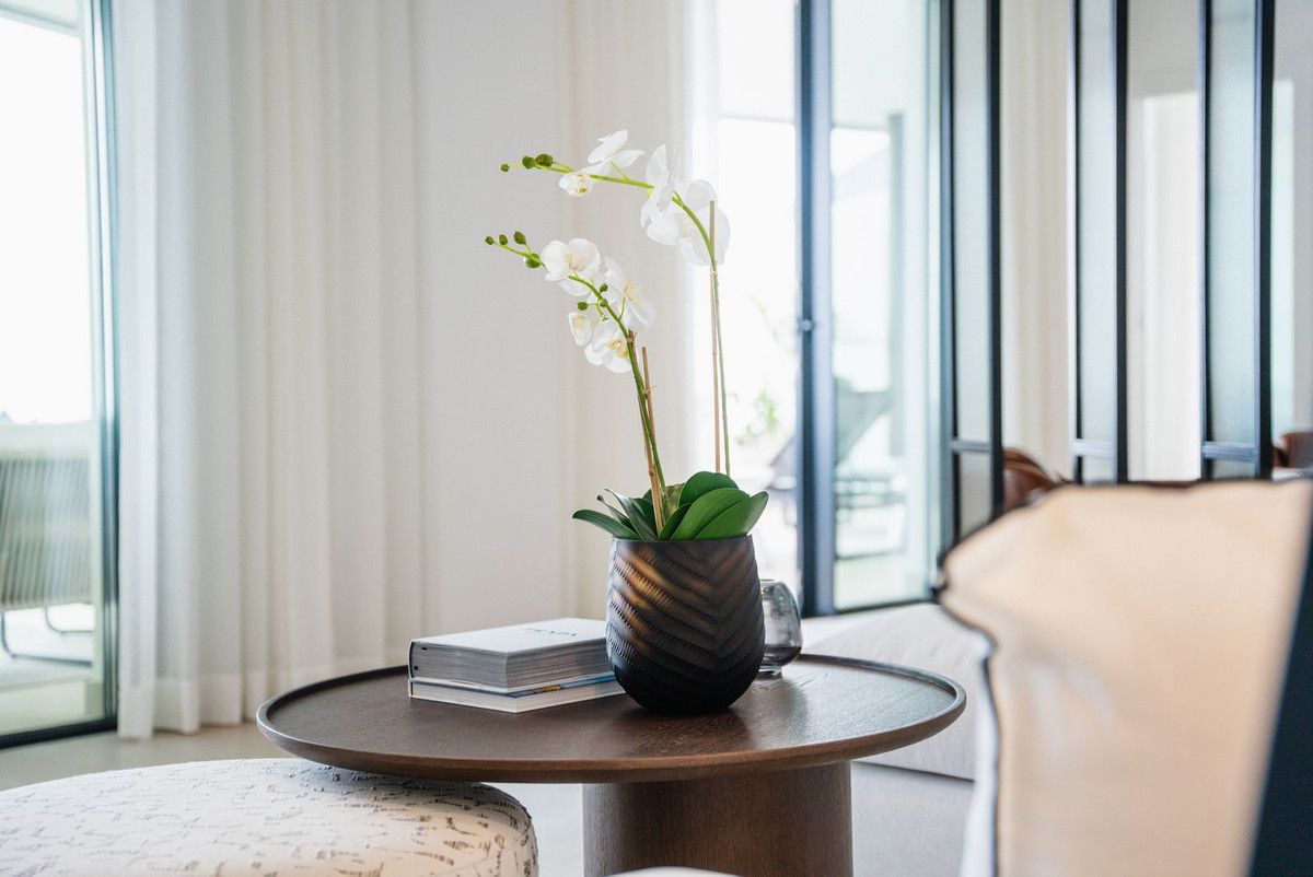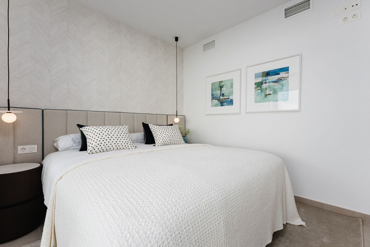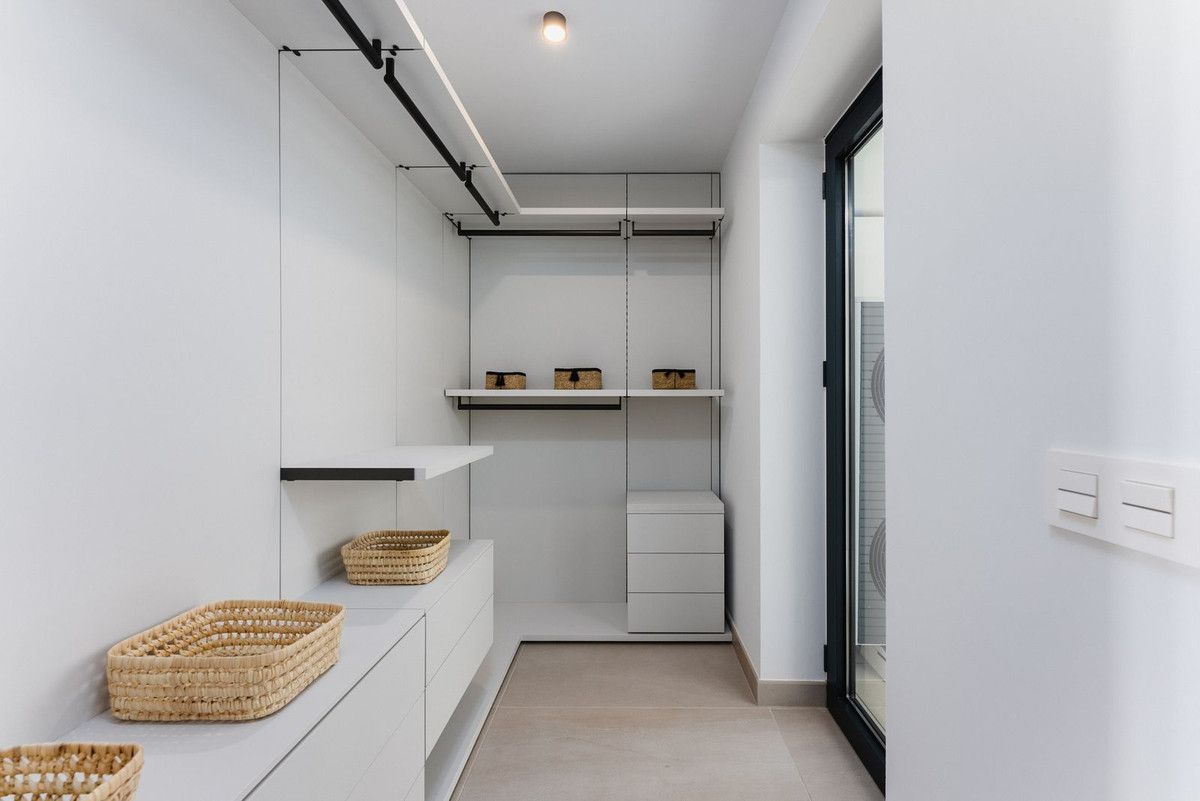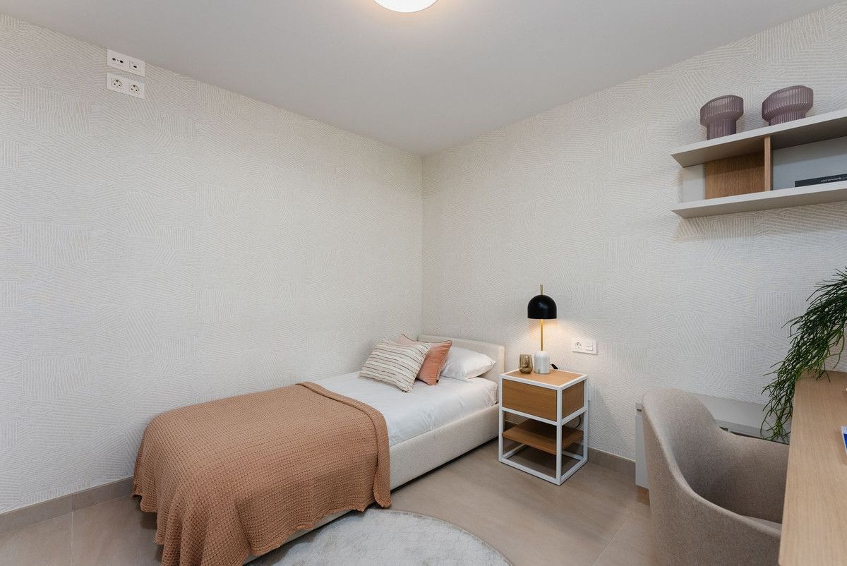 Layout: master bedroom with en-suite bathroom and dressing room and working nook, second bedroom also fully furnished with separate bathroom and toilet and great sea view. The third bedroom has, apart from the bed, a very practical working area with a desk. Of course there are built-in wardrobes. The room has a separate fully furnished bathroom.