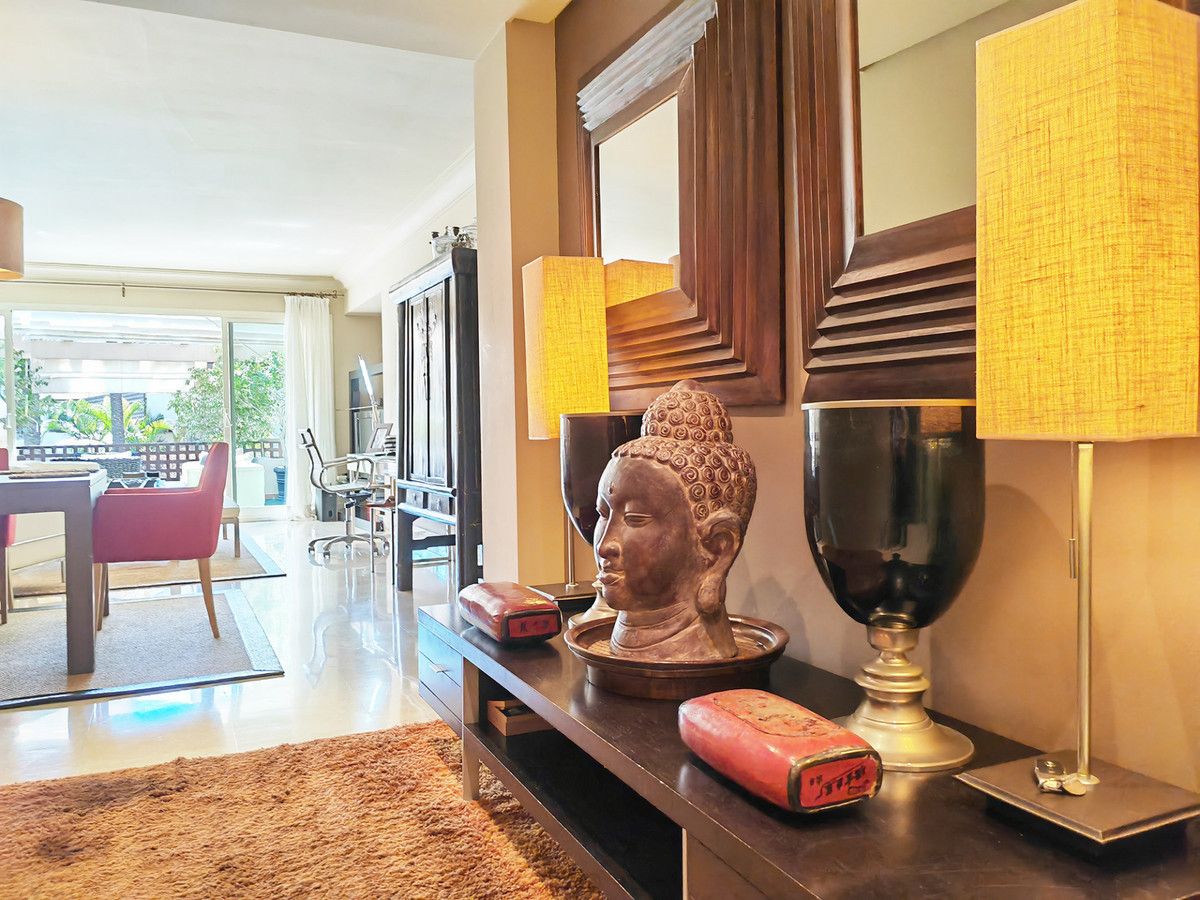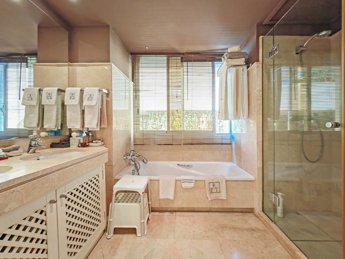 Apartment for sale in Golf Gardens, Marbella with 3 bedrooms, 2 en suite bathrooms, 1 toilet and with orientation south/east, with communal swimming pool, private garage (2 parking spaces) and communal garden. Regarding property dimensions, it has 161 m² built and 51 m² terrace. Has the following facilities amenities near, air conditioning, central heating, alarm, security service 24h, guest toilet, private terrace, kitchen equipped, living room, automatic irrigation system, laundry room, internet – wi-fi, covered terrace, 24h service, fitted wardrobes, gated community, lift, garden view, pool view, close to sea / beach, close to golf, optional furniture, excellent condition, saltwater swimming pool, close to town and surveillance cameras.