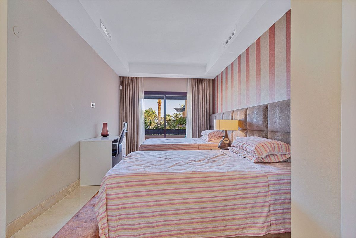 This breathtaking refurbished duplex penthouse offers a stunning beachside retreat, just steps from the wonderful promenade and beaches of San Pedro de Alcántara. The residence is bathed in natural sunlight throughout the day and features mesmerizing views of the lush communal gardens and the Mediterranean Sea. On the upper level, you'll discover the impressive master suite radiating elegance and sophistication. With high beamed ceilings, the master suite boasts a modern bathroom complete with a luxurious bath, double sink, and a spacious shower that doubles as a Hammam, offering a spa-like retreat within your home. The master suite gracefully extends onto two expansive terraces: one featuring a barbecue, kitchenette with a sink, dishwasher, wine fridge, ample storage, and a relaxing jacuzzi; and the other offering a partially covered large sitting area, perfect for al fresco dining. Recently upgraded to the highest standards of modern luxury, the property welcomes you with a partially renovated kitchen, equipped with top-of-the-line appliances and an integrated utility room, perfect for seamless daily living. The spacious living room and one of the guest bedrooms open onto the main-level terrace, providing a serene setting to enjoy the verdant garden views. This property also offers a convenient parking space and storage room in the underground communal garage, ensuring both practicality and security. The community is a tranquil haven, featuring extensive gardens with serene ponds, a large pool, and the added assurance of 24-hour surveillance. Offering unmatched luxury and convenience, this penthouse provides an exceptional living experience near the beach, with all amenities within easy walking distance. Whether you desire a permanent residence or a dreamy vacation retreat, this property ensures a lifestyle of elegance and sophistication on the beautiful Costa del Sol.