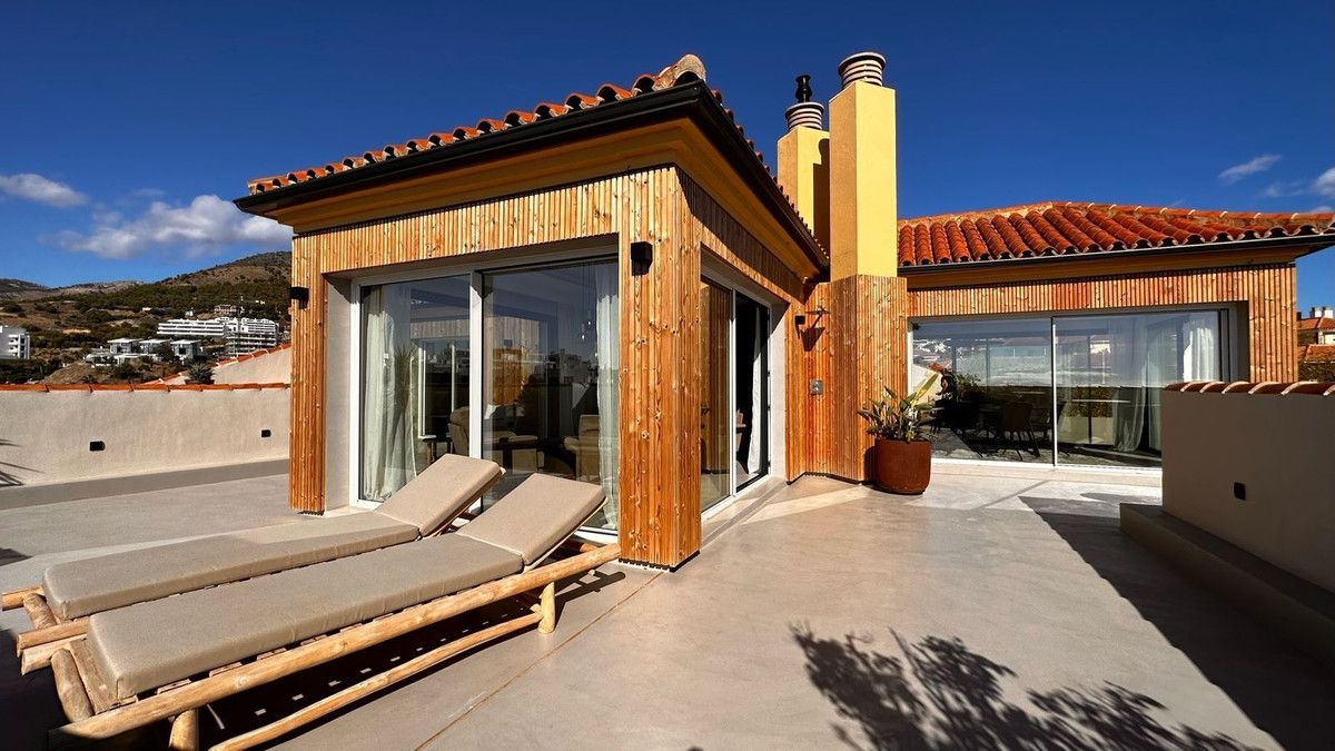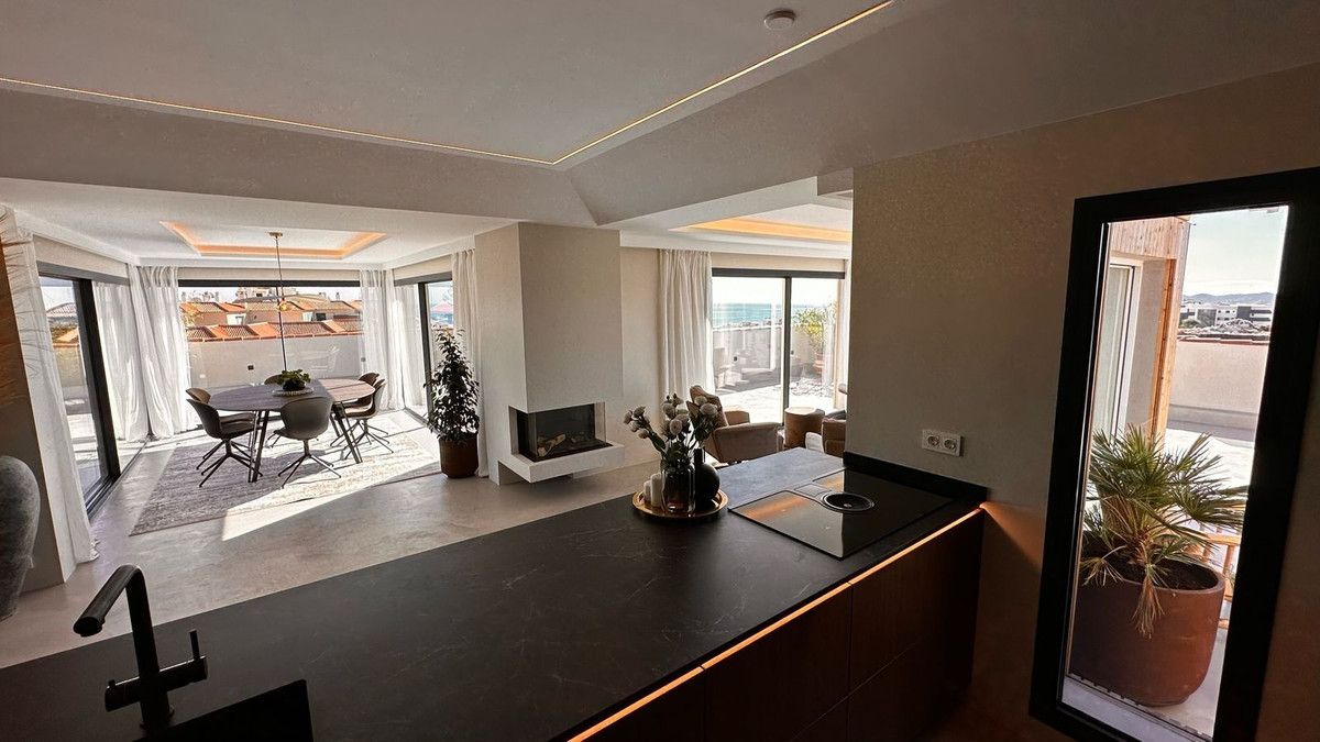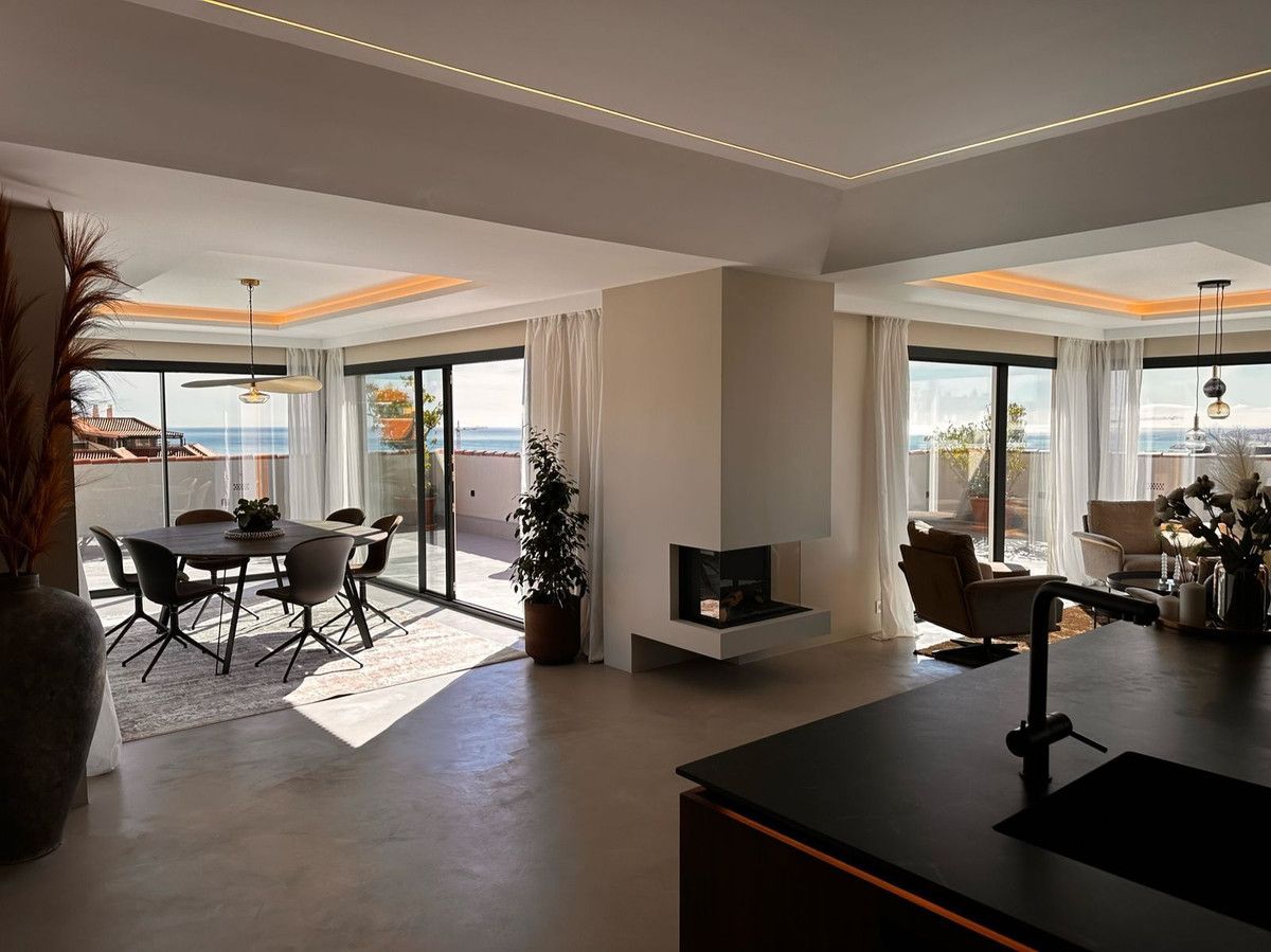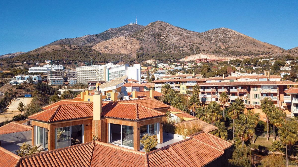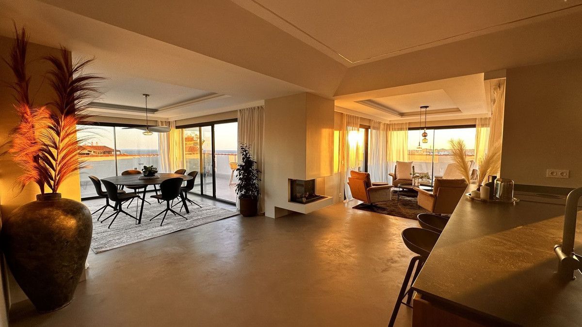 Welcome to this unique penthouse in popular El Higueron. The penthouse has an open floor plan with generous social spaces both inside as well as outside and three comfortable bedrooms with storage and two bathrooms, of which the master bedroom has a gorgeous en suite solution. The apartment is characterized by high quality material choices and standards, where products from Liebherr, Cortizo & Laminam harmonize well with the modern microcement flooring and the well-thought-out layout. The exclusive design and lighting of the inner ceiling, together with the centrally located fireplace, create an airy and luxurious atmosphere, and through the large windows a 150 sqm terrace opens up that stretches around the entire top floor and offers sun from sunrise to sunset. Here you can enjoy a fantastic view of the Mediterranean Sea to the east and south and the mountains to the west and north. In the morning you set the table for a breakfast and watch the sun rise from the Mediterranean Sea and in the evening you unwind in the lounge outside the master bedroom and watch the sun set over the mountains. This penthouse offers not only an elegant and stylish residence but also proximity to the Reserva del Higuerón Sports Club, a luxury sports and leisure center with 9 paddle tennis courts, tennis court, 4 beach volleyball courts, indoor and outdoor pools, spa with sauna and a well-equipped gym. The area of El Higueron is one of the most sought-after residential areas on the Costa del Sol, ideally located between the coastal towns of Benalmadena and Fuengirola and only 15 minutes from Malaga Airport. This gated community features 24-hour surveillance with cameras and security guards patrolling the premises. Enhancing convenience, a complimentary shuttle service is available to transport residents and guests to the mall, train station, and beach. Seize the opportunity to enjoy this oasis — your dream lifestyle awaits!
