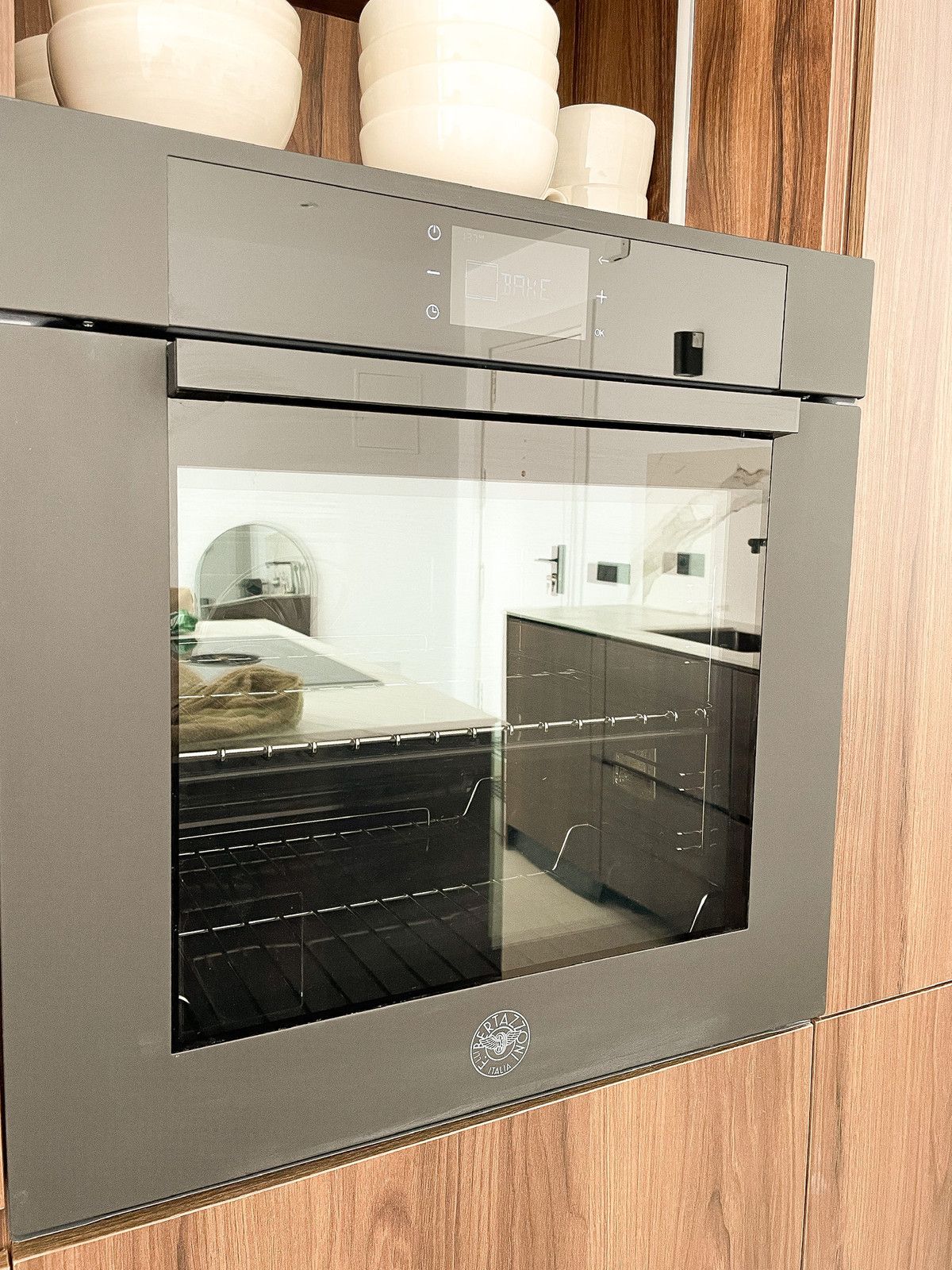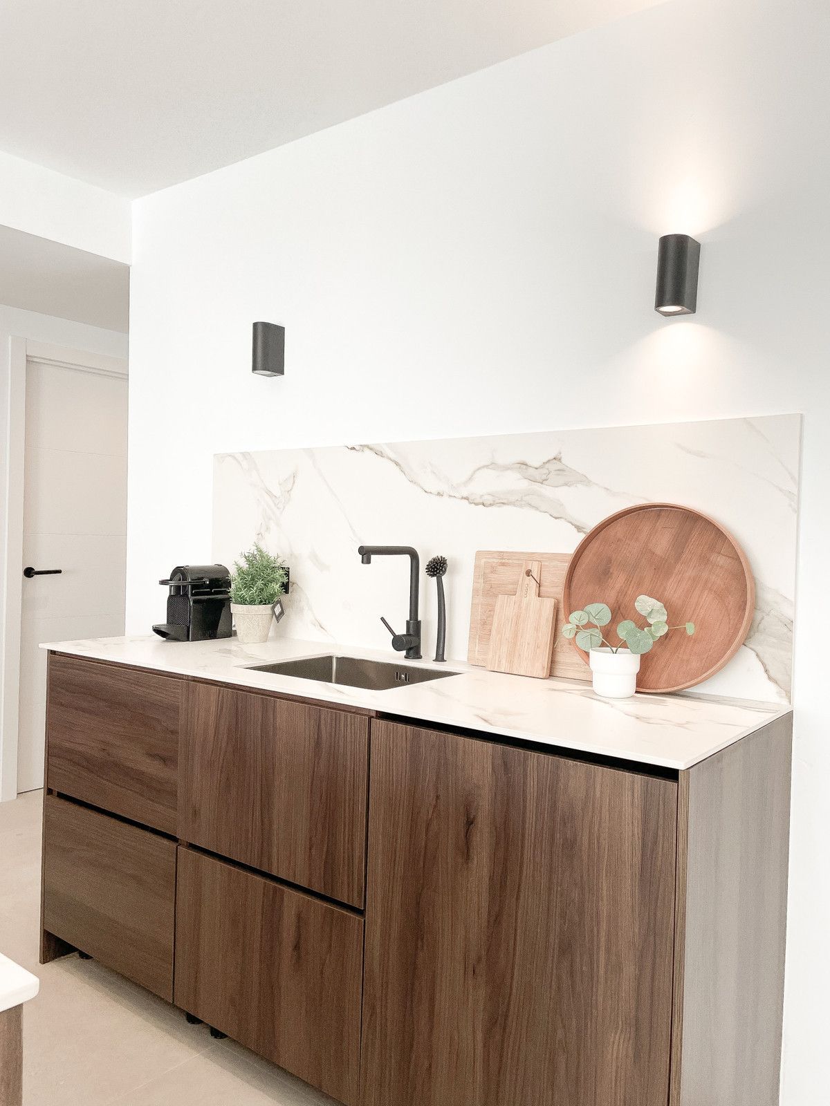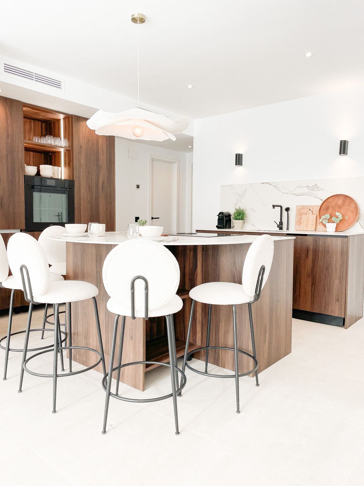 Handcrafted carpentry, kitchen cabinetry, wardrobes, and bathroom fittings are beautifully executed in rich walnut, while the flooring throughout glistens with artens 60×60 beige porcelain tiles. The kitchen and bathroom countertops shine in sturdy Italian Calacatta porcelain, adding another touch of luxury to this distinguished dwelling.