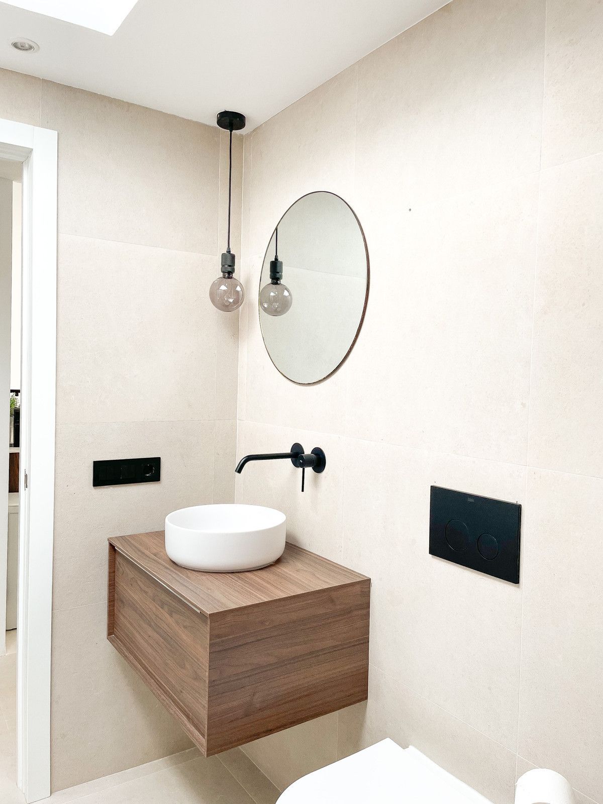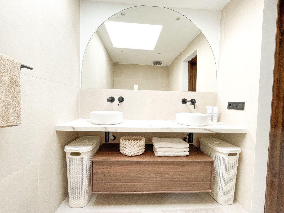The property boasts a bespoke kitchen, a masterstroke of design artistry featuring a unique rounded island and top-tier Bertazzoni appliances. Consistent design elements flow throughout the residence with harmonizing 60×60 beige porcelain tiles adorning the floors, bathroom walls, and outdoor areas. Sleek black detailing and skylights in both bathrooms impart a sophisticated modern flair, ensuring a lifestyle of luxury bathed in sunshine.