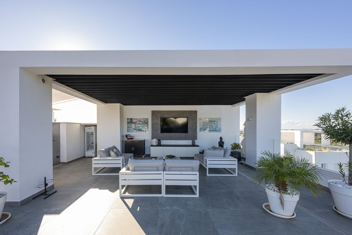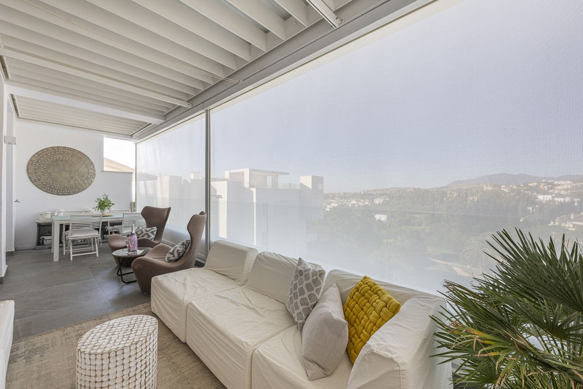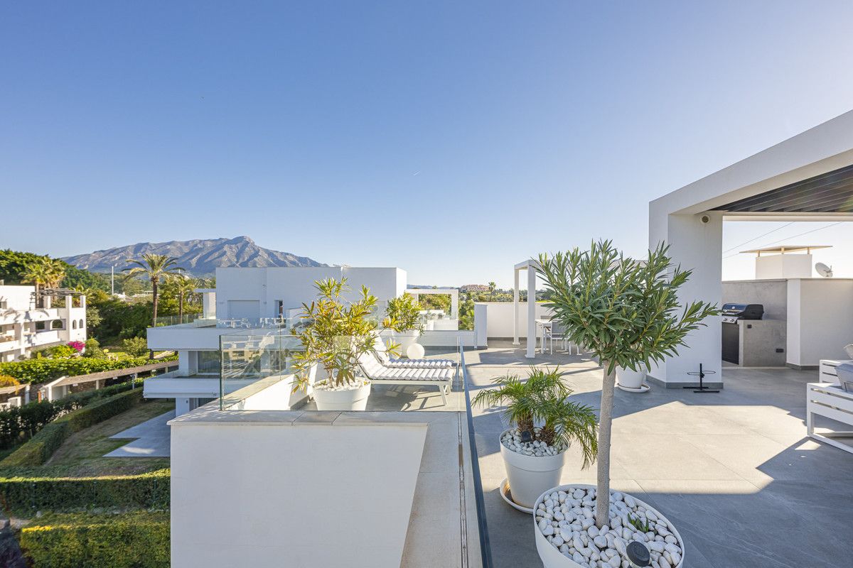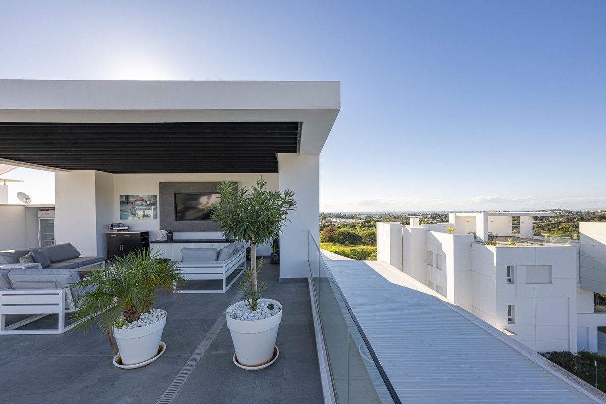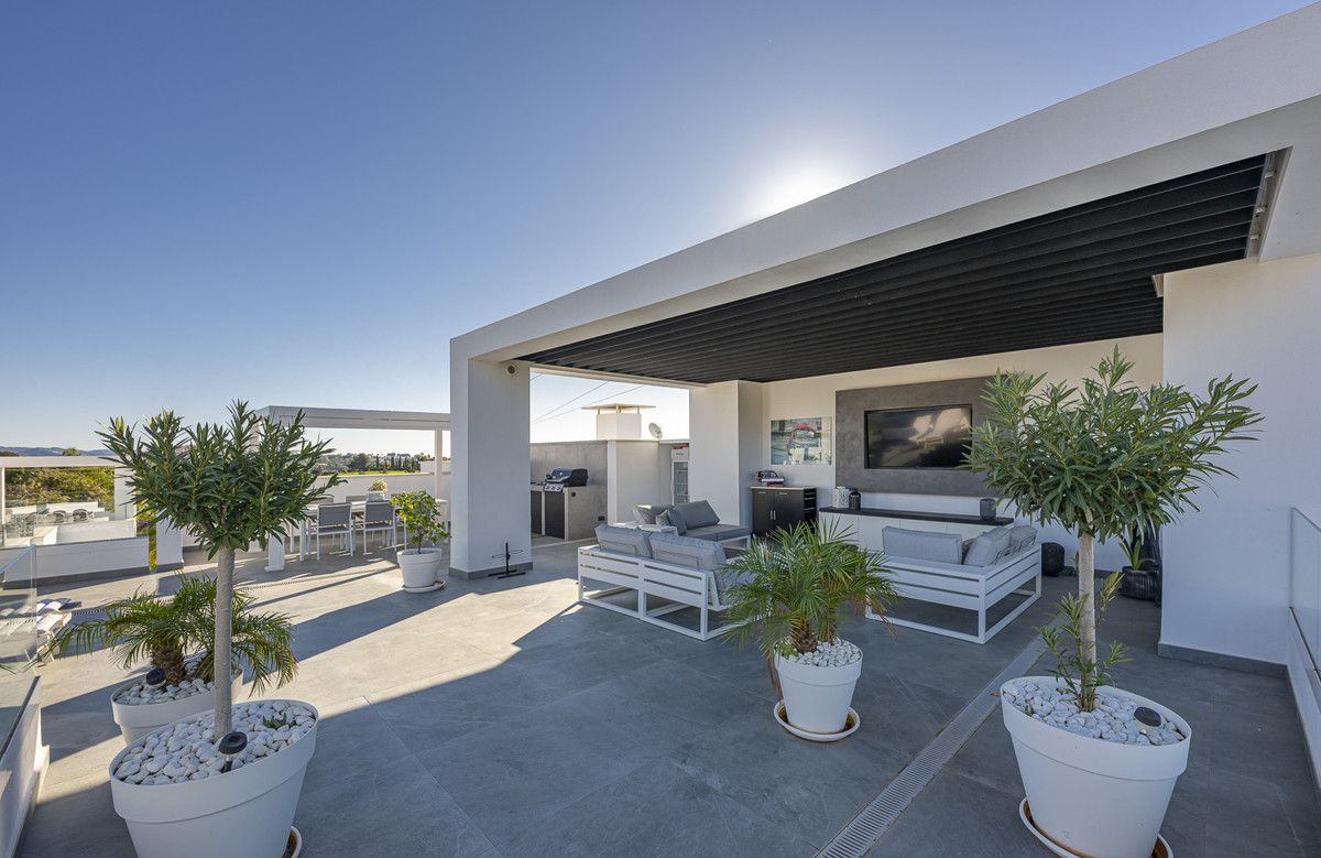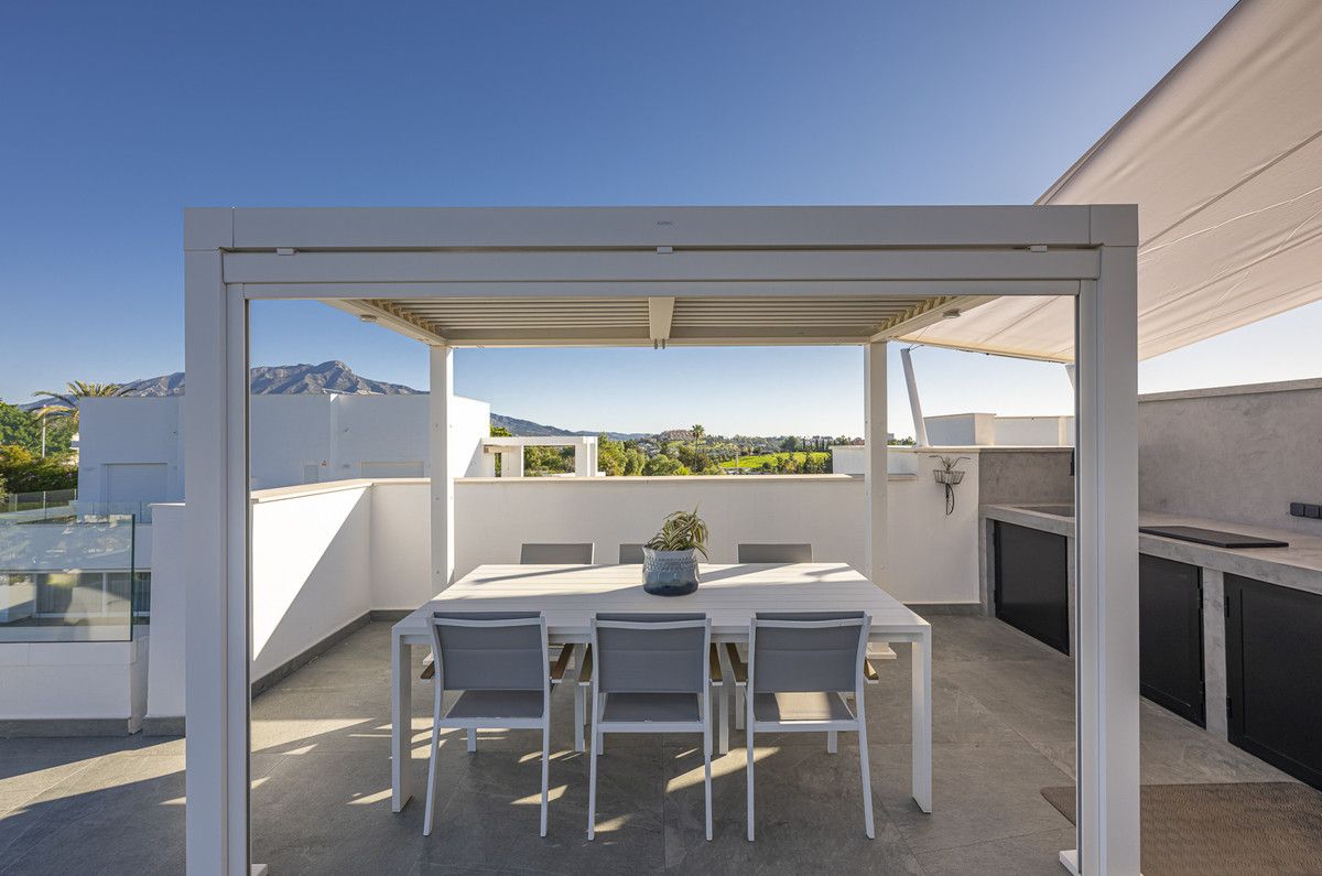 Superb modern duplex penthouse situated in the exclusive area of La Quinta, with absolutely stunning mountain, golf views and partial sea views. Benefits include a private lift and exceptional roof terrace. Set in a private gated community of only 14 exclusive apartments with communal landscaped gardens and swimming pool. All within easy reach of Puerto Banus, San Pedro de Alcantara and Nueva Andalucia. This exceptional property has a lift that arrives into the interior of the penthouse, which can only be accessed by this apartment at this level. The other notable feature of this property is the fabulous roof terrace which has it´s own all weather cinema and superb views. The living area is all on one level and comprises large entrance hall, stylish open plan lounge/diner with modern fully fitted kitchen incorporating bespoke units. This room opens on to a lovely west facing terrace which allows for an outdoor seating and dining area with automatic sun blinds. From the entrance hallway you access the bedrooms. Master suite with separate dressing room and en-suite bathroom. Two further double bedrooms and family bathroom. From the living area terrace there is an enclosed staircase to the magnificent roof terrace., where you can truly enjoy the best of the Spanish weather. Affording 147m2 of outdoor living space with 360 degree panoramic views. This area incorporates a covered seating area with an all weather TV, excellent built-in summer kitchen/BBQ, covered dining area, automated sun blinds and an outdoor shower. The property includes two private underground parking spaces and a storeroom.
