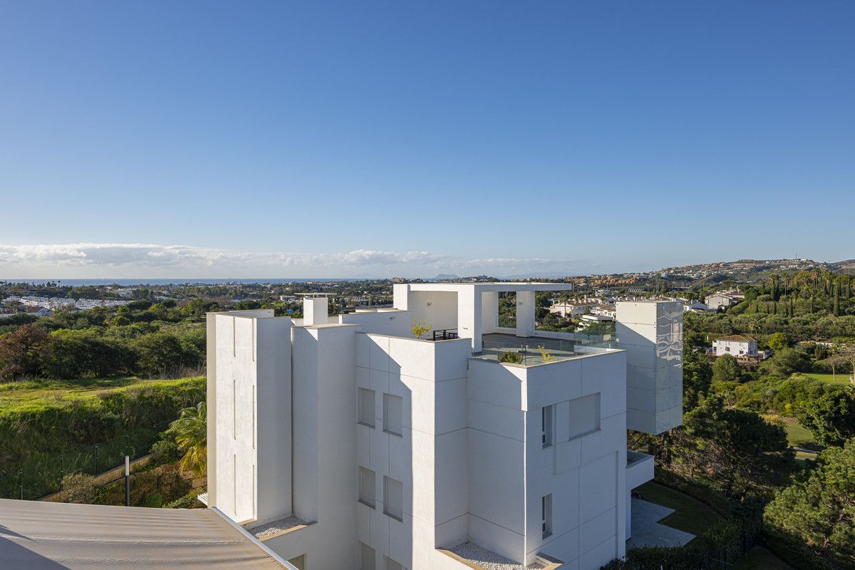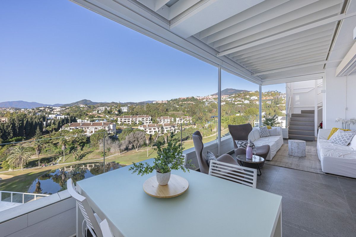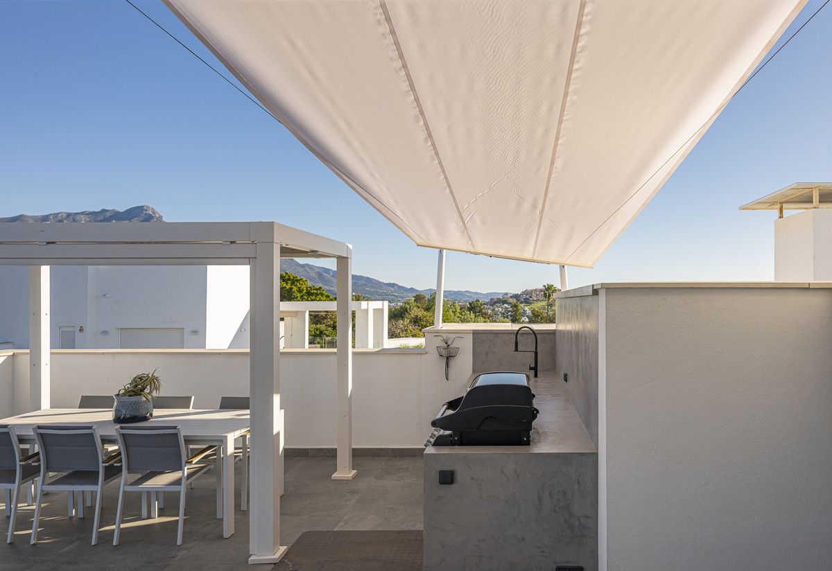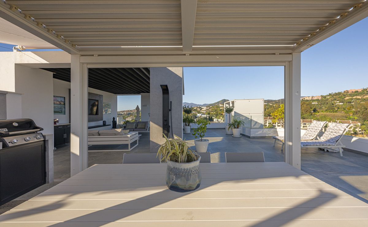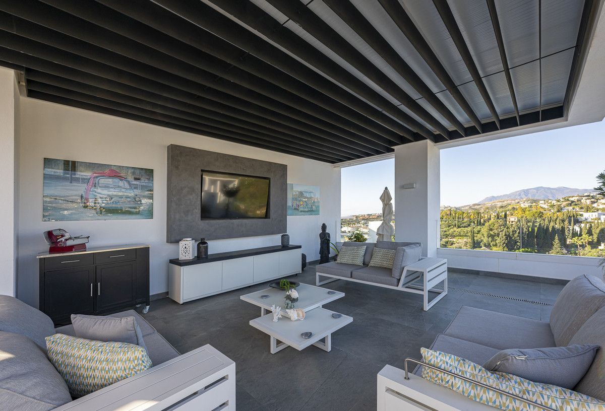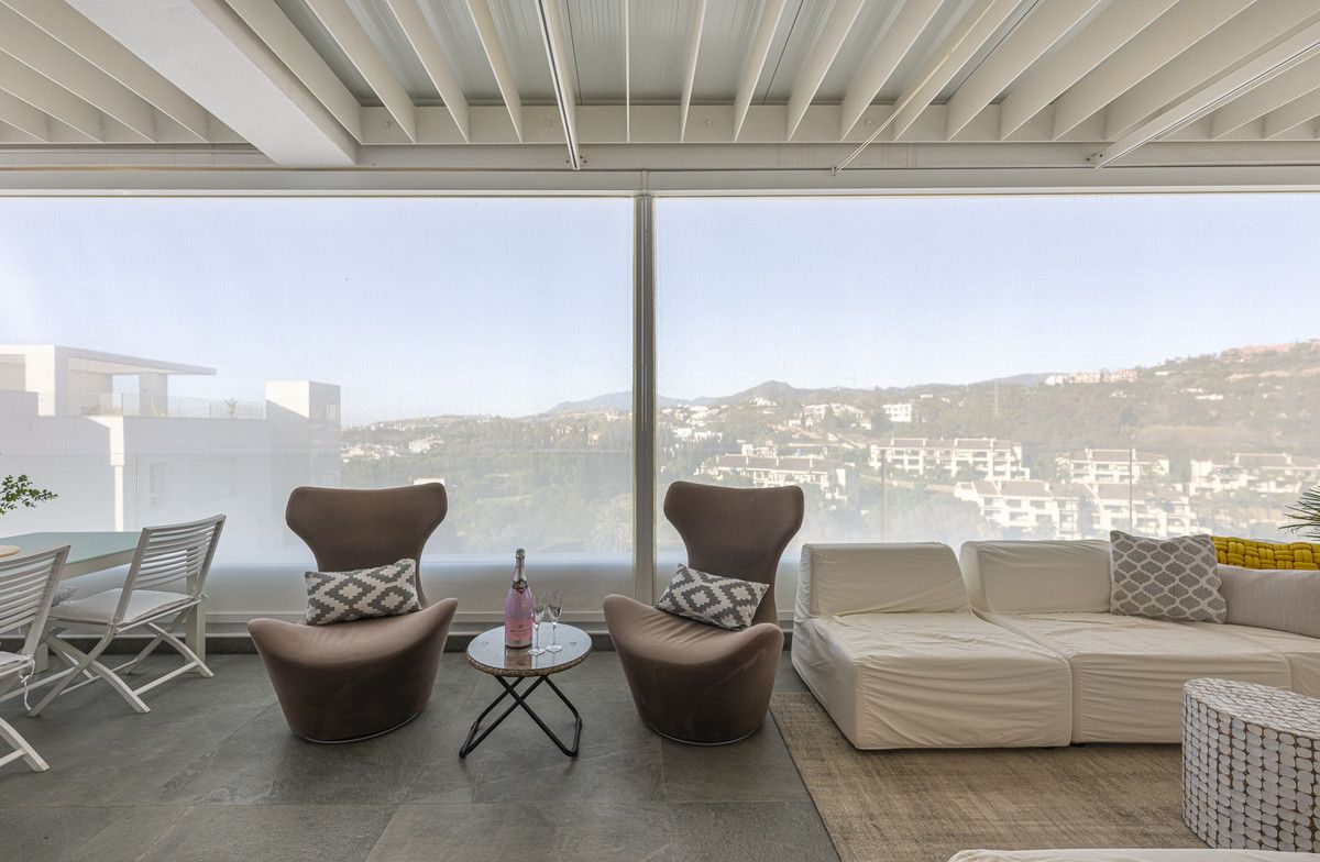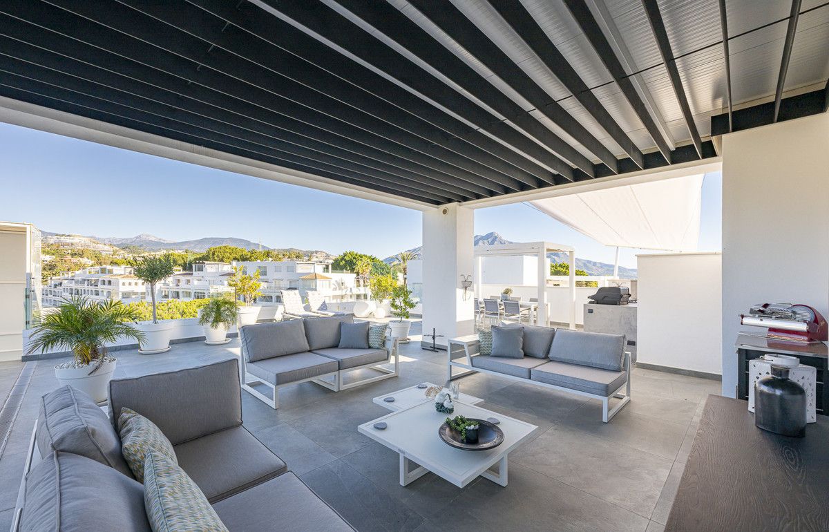 Superb modern duplex penthouse situated in the exclusive area of La Quinta, with absolutely stunning mountain, golf views and partial sea views. Benefits include a private lift and exceptional roof terrace. Set in a private gated community of only 14 exclusive apartments with communal landscaped gardens and swimming pool. All within easy reach of Puerto Banus, San Pedro de Alcantara and Nueva Andalucia. This exceptional property has a lift that arrives into the interior of the penthouse, which can only be accessed by this apartment at this level. The other notable feature of this property is the fabulous roof terrace which has it´s own all weather cinema and superb views. The living area is all on one level and comprises large entrance hall, stylish open plan lounge/diner with modern fully fitted kitchen incorporating bespoke units. This room opens on to a lovely west facing terrace which allows for an outdoor seating and dining area with automatic sun blinds. From the entrance hallway you access the bedrooms. Master suite with separate dressing room and en-suite bathroom. Two further double bedrooms and family bathroom. From the living area terrace there is an enclosed staircase to the magnificent roof terrace., where you can truly enjoy the best of the Spanish weather. Affording 147m2 of outdoor living space with 360 degree panoramic views. This area incorporates a covered seating area with an all weather TV, excellent built-in summer kitchen/BBQ, covered dining area, automated sun blinds and an outdoor shower. The property includes two private underground parking spaces and a storeroom.