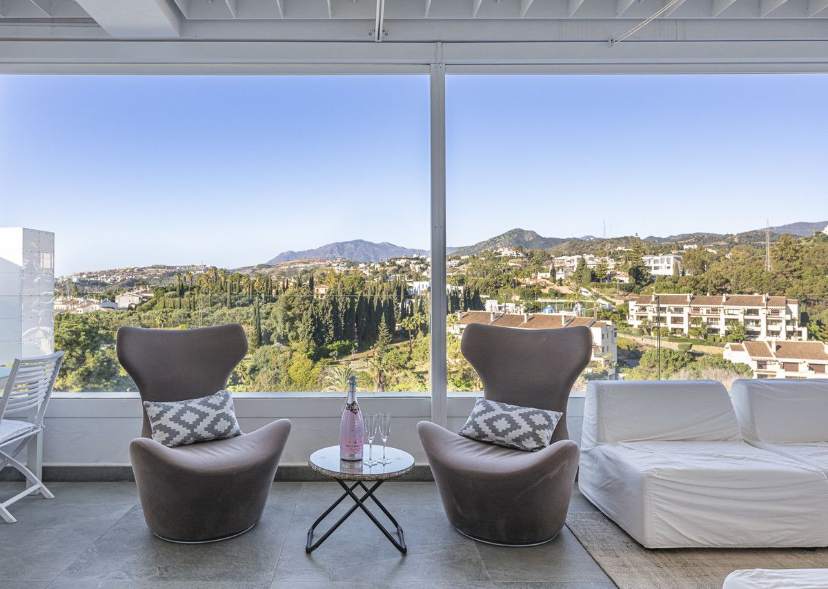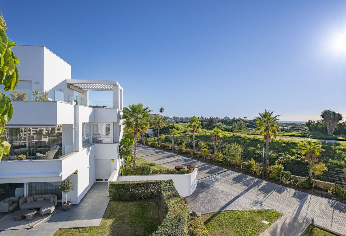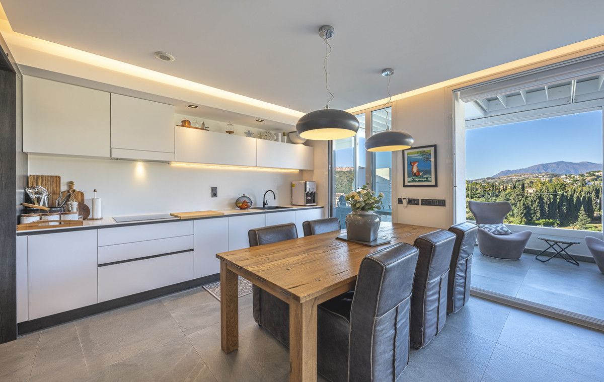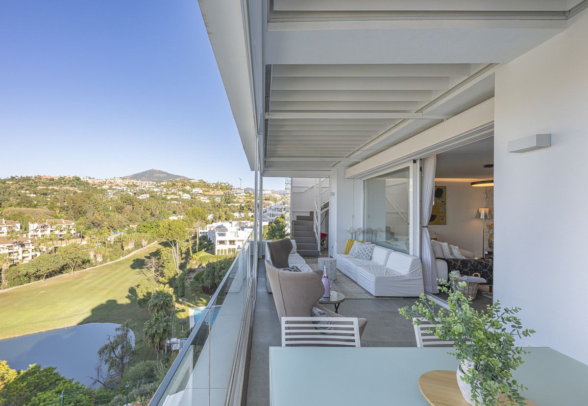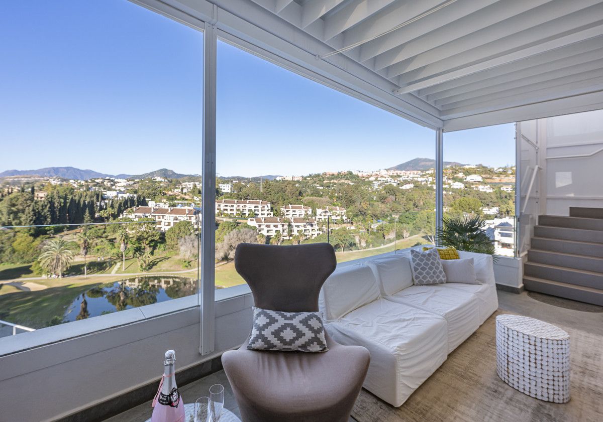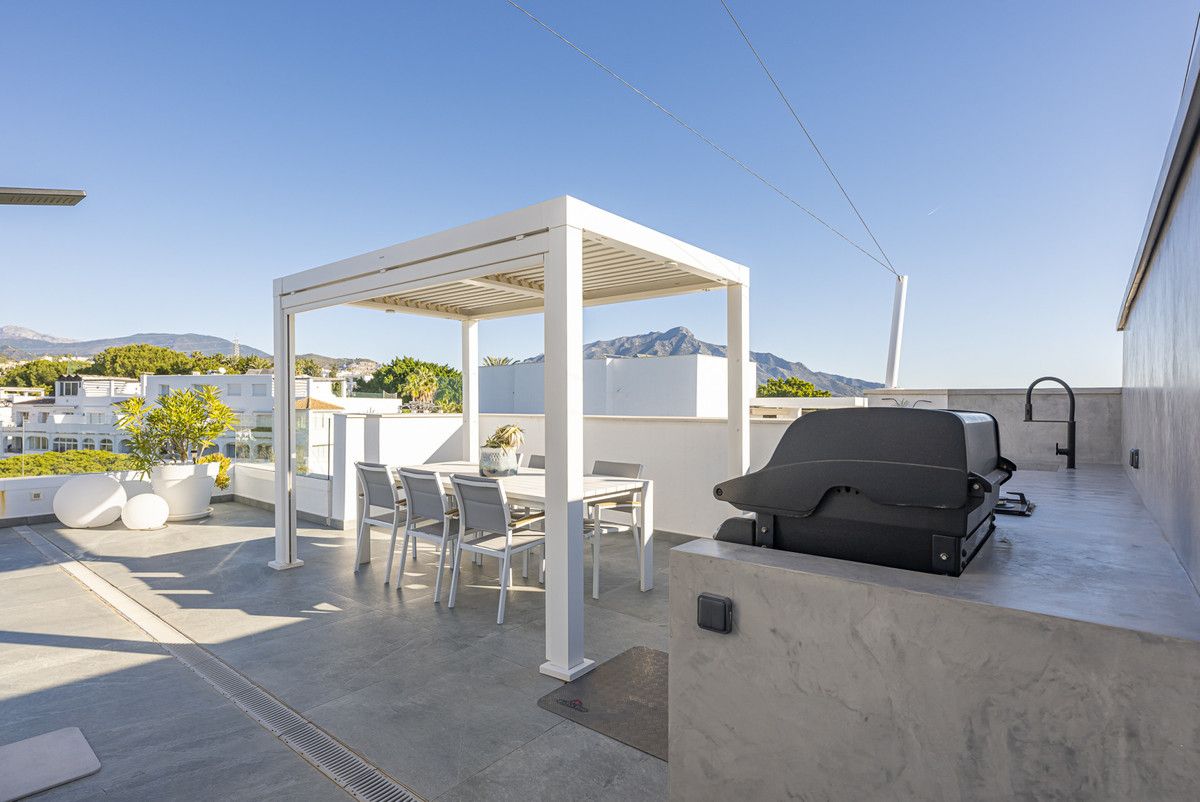 Superb modern duplex penthouse situated in the exclusive area of La Quinta, with absolutely stunning mountain, golf views and partial sea views. Benefits include a private lift and exceptional roof terrace. Set in a private gated community of only 14 exclusive apartments with communal landscaped gardens and swimming pool. All within easy reach of Puerto Banus, San Pedro de Alcantara and Nueva Andalucia. This exceptional property has a lift that arrives into the interior of the penthouse, which can only be accessed by this apartment at this level. The other notable feature of this property is the fabulous roof terrace which has it´s own all weather cinema and superb views. The living area is all on one level and comprises large entrance hall, stylish open plan lounge/diner with modern fully fitted kitchen incorporating bespoke units. This room opens on to a lovely west facing terrace which allows for an outdoor seating and dining area with automatic sun blinds. From the entrance hallway you access the bedrooms. Master suite with separate dressing room and en-suite bathroom. Two further double bedrooms and family bathroom. From the living area terrace there is an enclosed staircase to the magnificent roof terrace., where you can truly enjoy the best of the Spanish weather. Affording 147m2 of outdoor living space with 360 degree panoramic views. This area incorporates a covered seating area with an all weather TV, excellent built-in summer kitchen/BBQ, covered dining area, automated sun blinds and an outdoor shower. The property includes two private underground parking spaces and a storeroom.