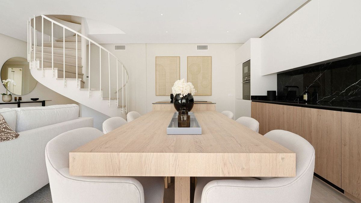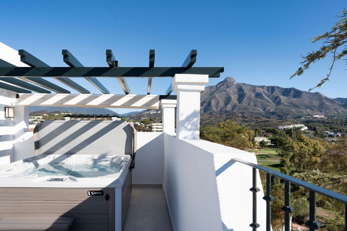 Welcome to this newly fully refurbished duplex penthouse in a popular urbanisation in Nueva Andalucia. As you enter you are greeted by the light and the soft colour scheme creating a feeling warmth and luxury. The open plan kitchen, living and dining room opens up to double doors onto the lower terrace which is perfect for that morning coffee. On this floor you also have the 4th bedroom and the combined bathroom and guest toilet. On the 2nd floor you have the large mastersuite with plenty of wardrobe space, large bathroom and a beautiful bay window looking towards Marbella and the sea. 2 guest rooms sharing a family bathroom completes this floor. The 3rd houses the solarium with beautiful sea and mountain views, a top of the line Jacuzzi and a storage room completes this space. The urbanisation has 3 pools, 24 hrs security and is situated close to the Aloha Strip with plenty of restaurants and services. Easy access to the penthouse from the underground parking space.